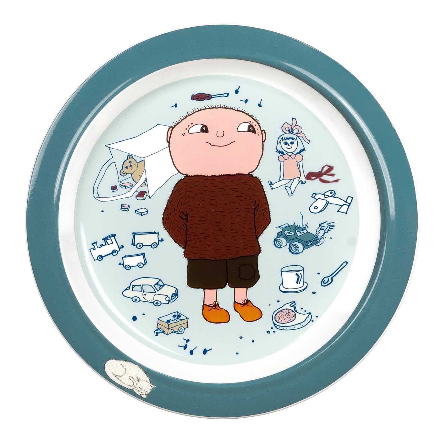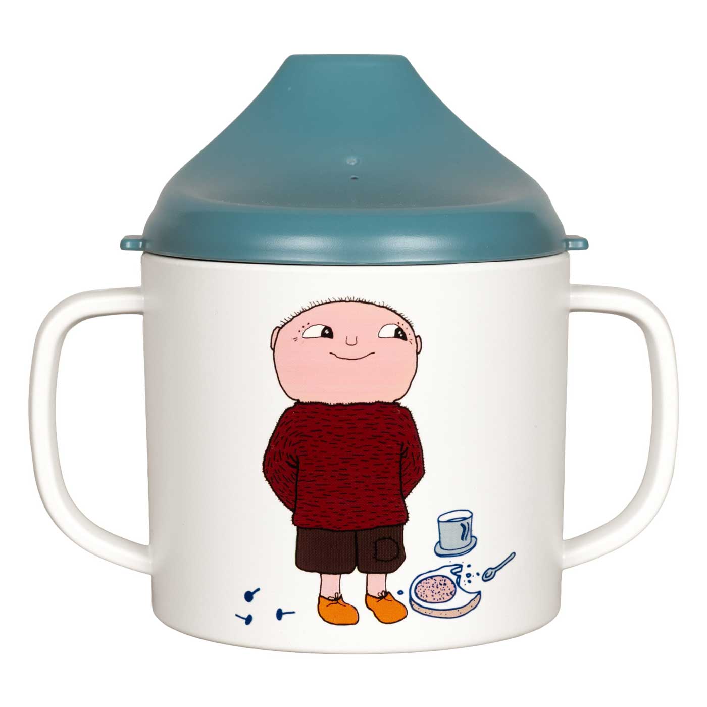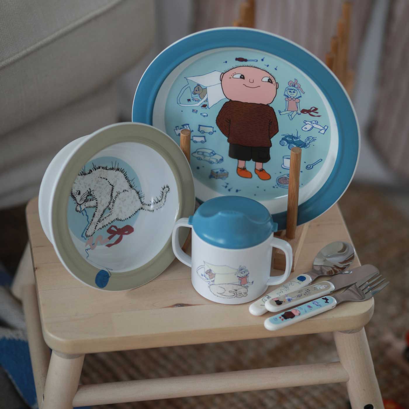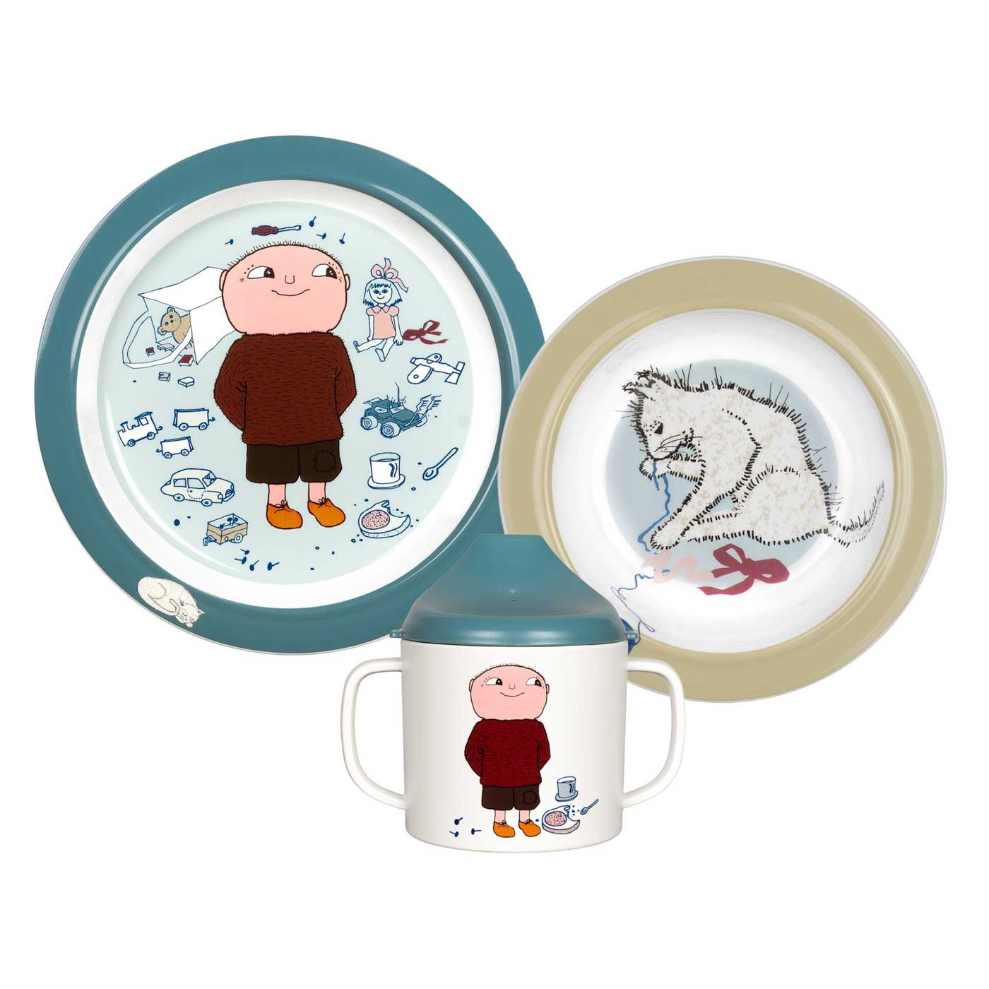 Alfons Åberg Barnservis 3 delar består av tre delar: pipmugg med spillsäkert lock där spillsäkringen är lätt att hålla ren, praktisk sugkoppstallrik med lagom skålade sidor för att underlätta för små barn att äta själva samt en flat tallrik med antiglidring.
