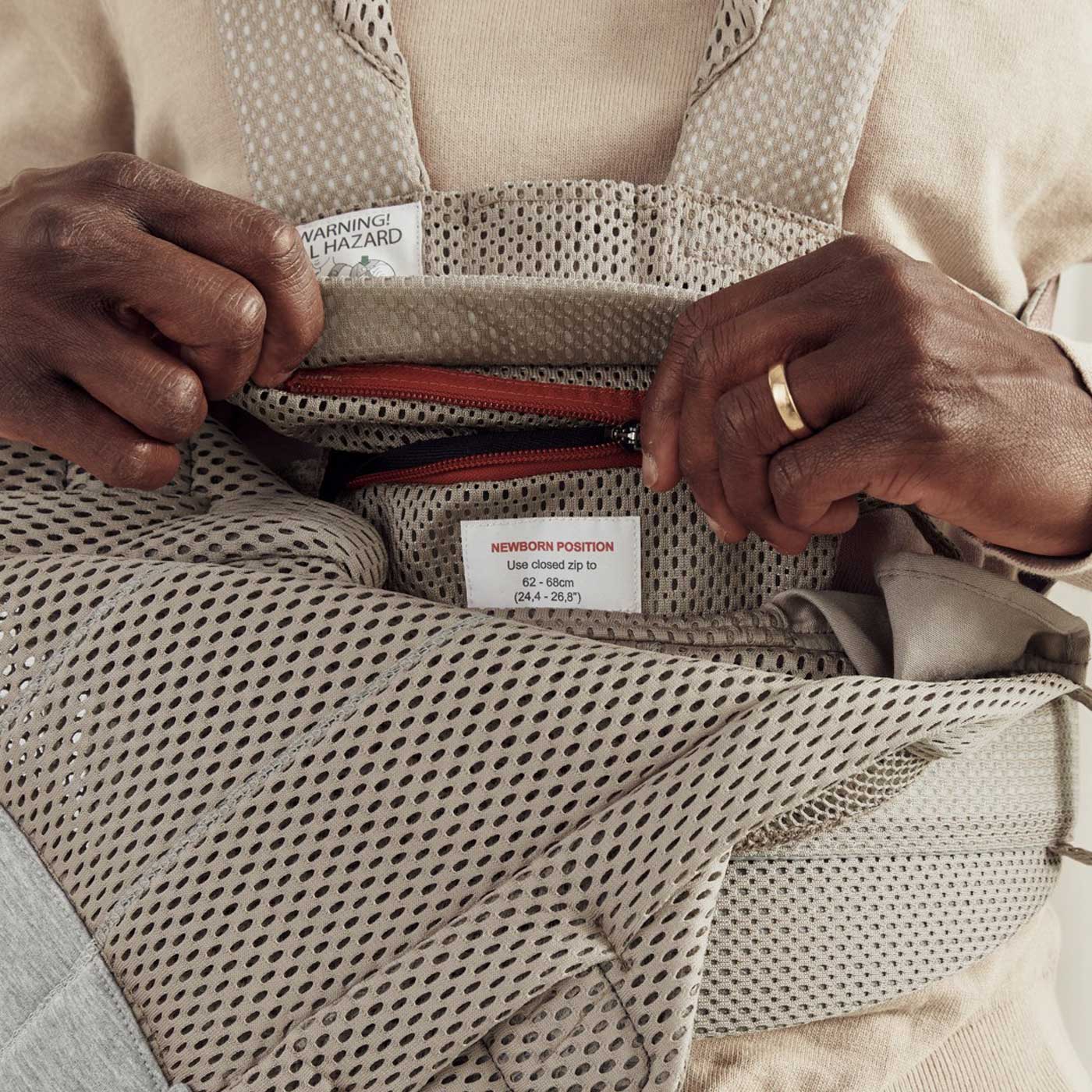 För att ge optimal komfort till din växande bebis, och för att du ska kunna bära så bekvämt som möjligt finns det en höjdinställning för nyfödda och ett för större barn. När du bär ditt större barn flyttar du ned bältet på höften, så att ditt barn hamnar i rätt höjd och du får bättre avlastning.