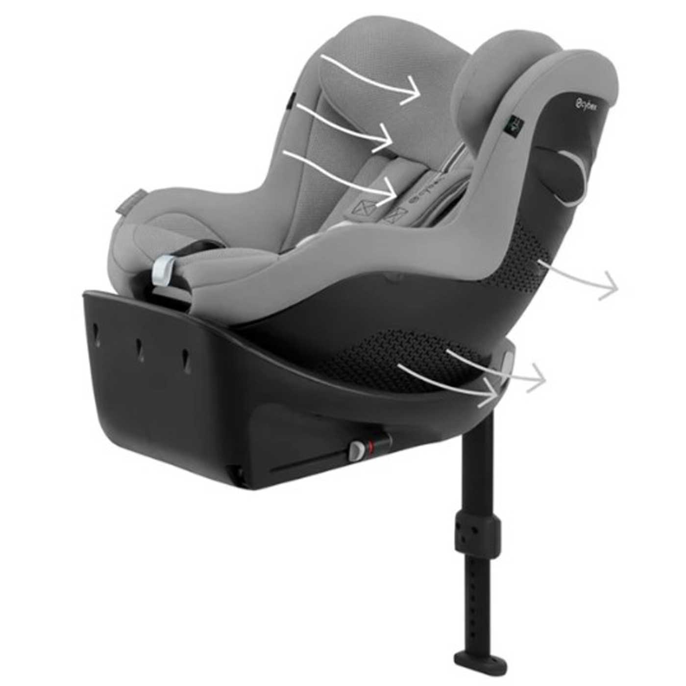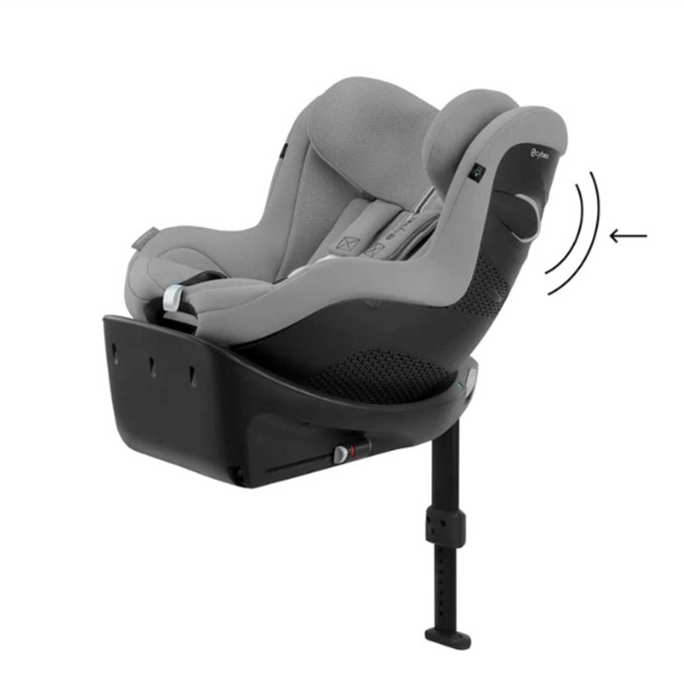 Stolen är utrustad med en roterbar bas som kan vridas åt sidan, vilket gör det enkelt att lyfta i och spänna fast barnet. Lutningen kan justeras med en hand under färd, så att barnet sitter bekvämt eller kan vila.