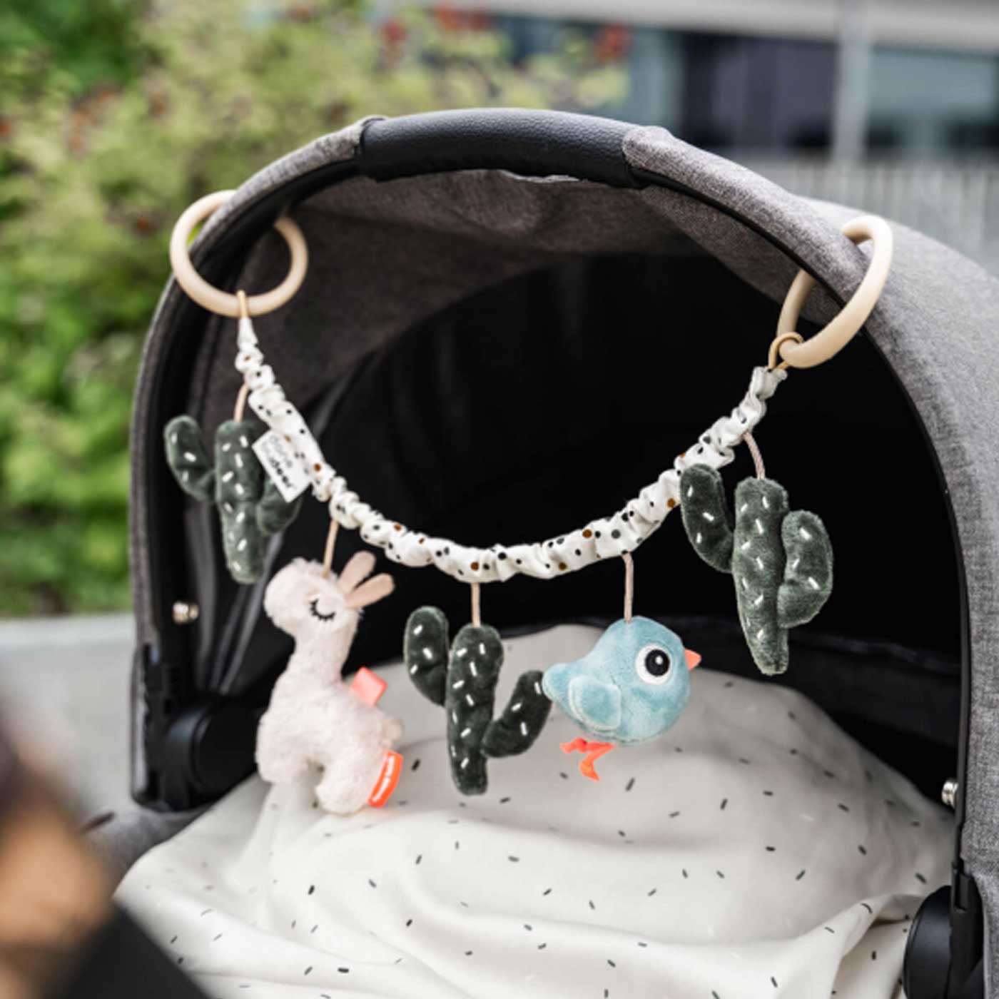 Barnvagnshänget kan enkelt fästas på flera olika sätt – i vagnen, ovanför skötbordet eller i ett babygym – vilket gör det till en praktisk leksak som följer med i vardagen. De fastsydda detaljerna gör den barnsäker och godkänd redan från nyfödd.