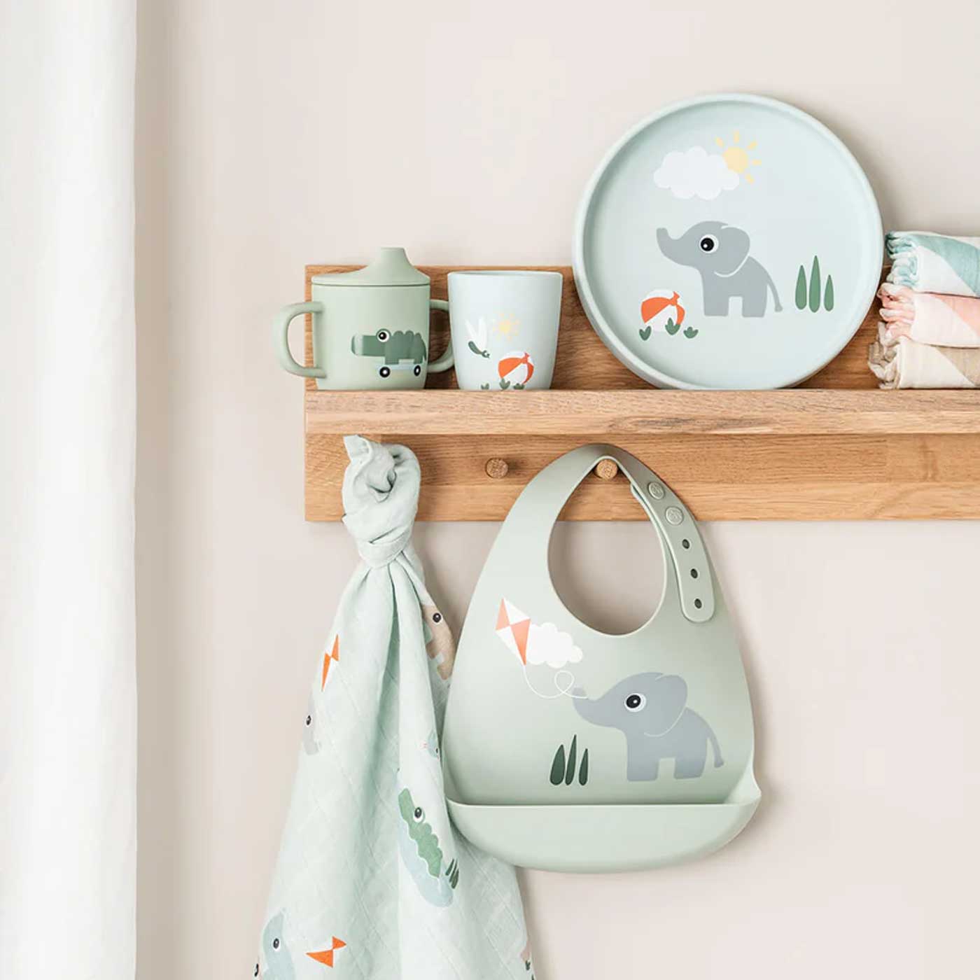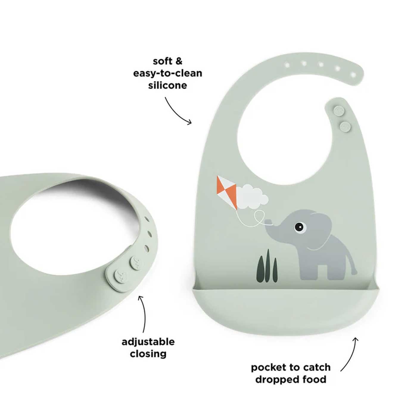 En söt silikonhaklapp från Done By Deer som är perfekt när barnet börjar utforska mat och dryck. Den mjuka haklappen är vattentät och försedd med en praktisk uppsamlingsficka som fångar upp spill och skyddar kläderna under måltiden. Haklappen är justerbar med dubbelknäppning för en bra passform.