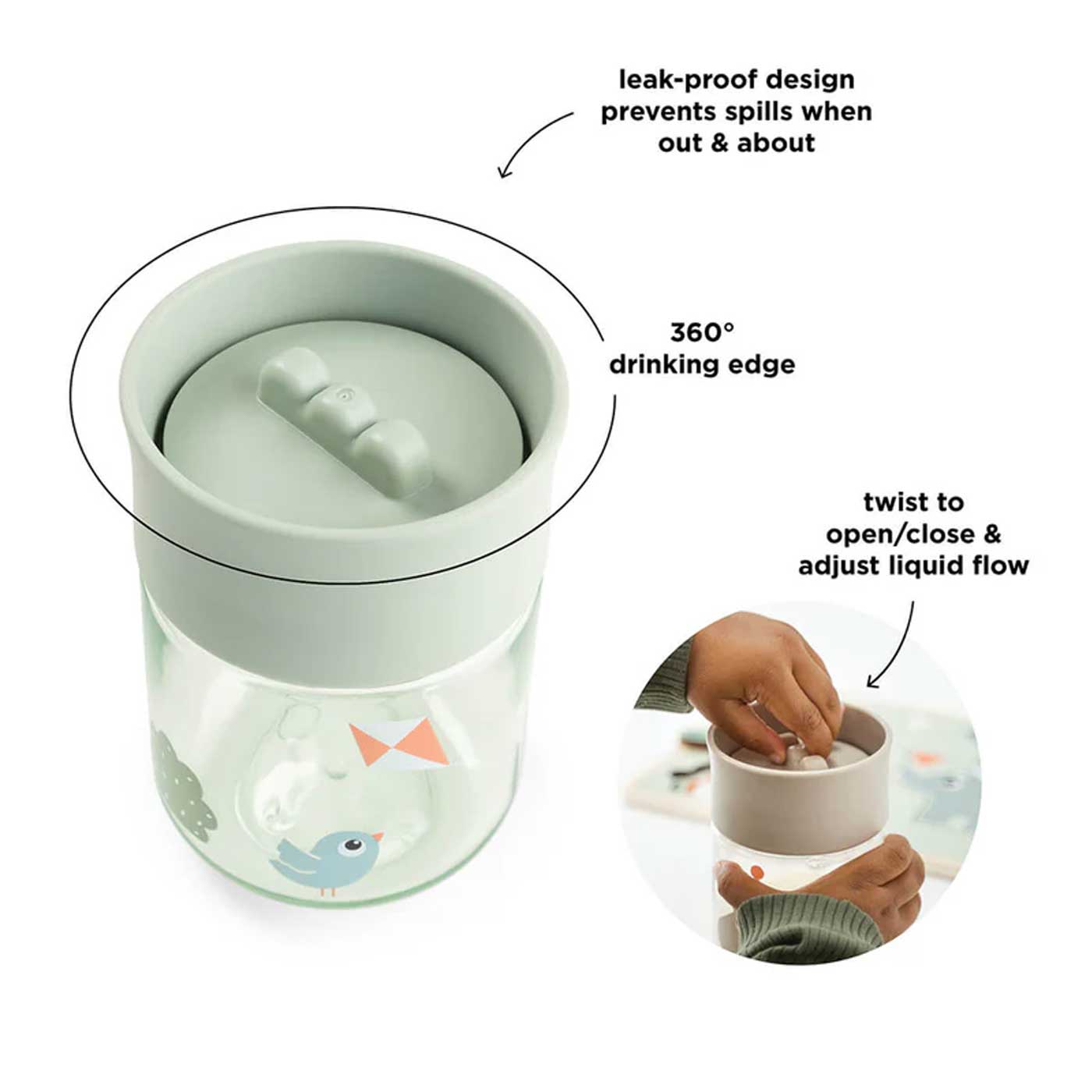 Det vridbara locket gör det enkelt att anpassa flödet i takt med barnets utveckling, medan den lätt lutade kanten ger ett mjukt och kontrollerat drickflöde. Den läckagesäkra konstruktionen minskar spill och gör muggen lika praktisk hemma som på utflykten.