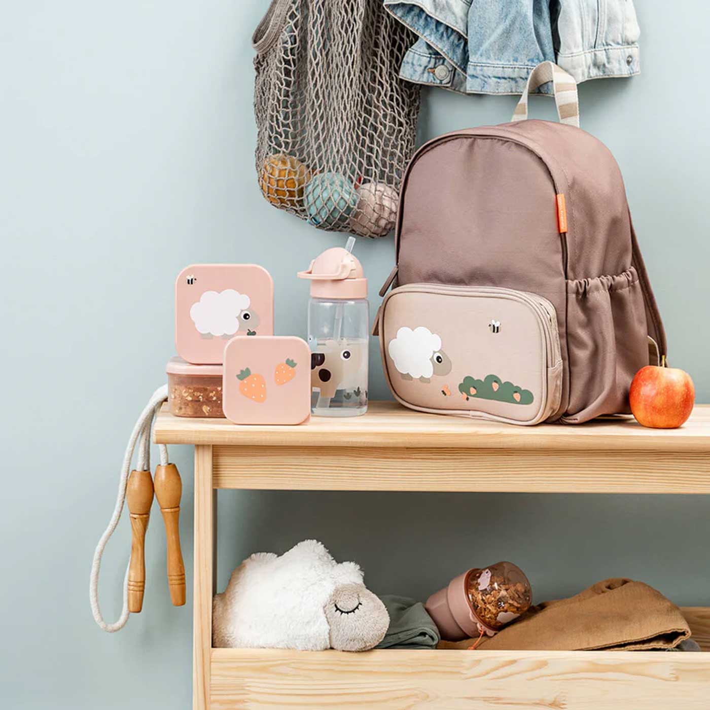 Done By Deer Sugrörsflaska Tiny Farm Powder är en vattenflaska som har ett smart sugrör som göms när du stänger locket, så du slipper oroa dig för oinbjuden smuts eller spill. Det smarta handtaget gör att du också kan fästa flaskan på ryggsäcken, och gör det lättare för ditt barn att öppna flaskan själv.