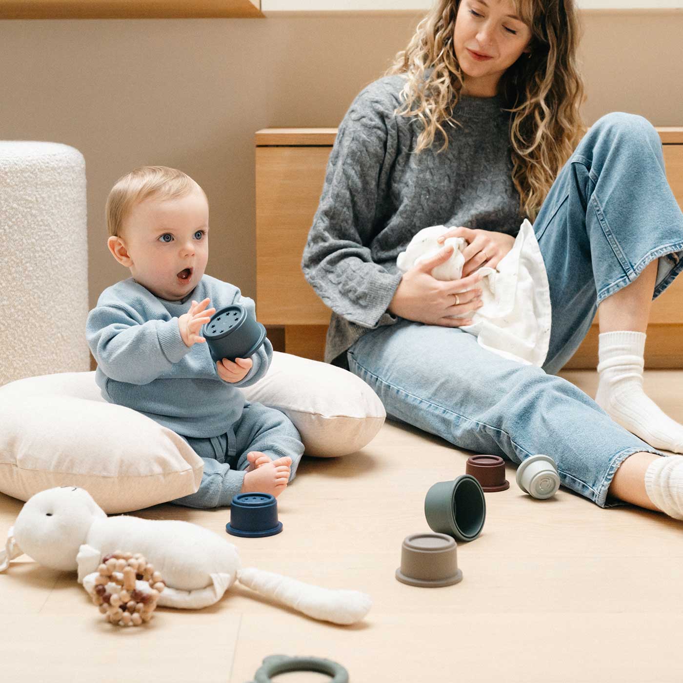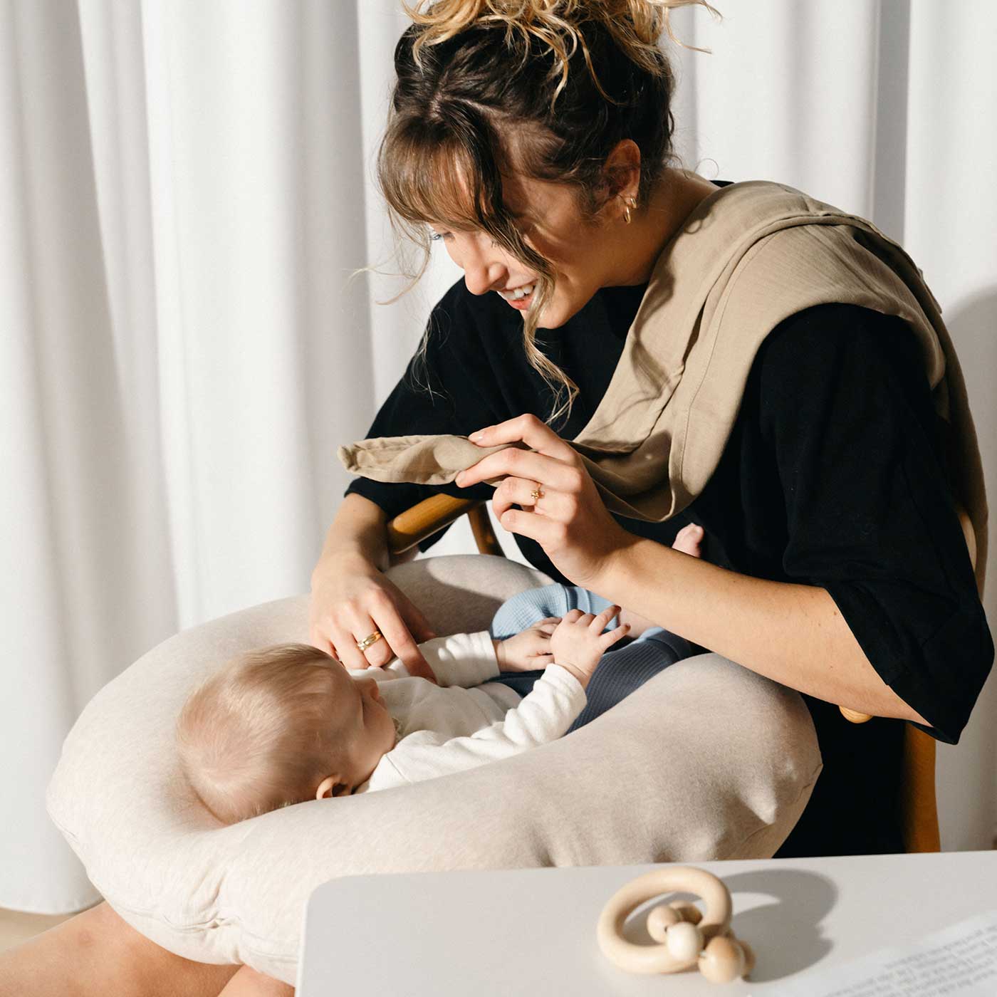 Doomoo Amningskudde Melerad Sand är en C-formad amningskudde som sitter stadigt runt mammans mage. Den är fylld med minimala, prasselfria EPS-kulor som formar sig efter mammans och babyns kropp. Kudden är mjuk och skön, och behåller sin stuns under hela amningen, utan att sjunka ihop. På så sätt tappar inte barnet greppet om bröstvårtan och får en optimal amningsposition.