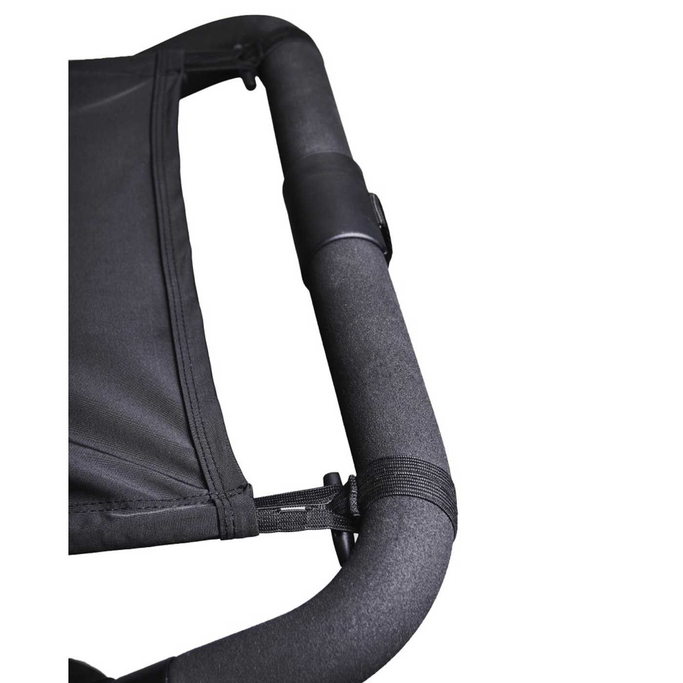 Solskyddet ger generös skugga samtidigt som den släpper in luft från sidorna, vilket skapar en sval och behaglig miljö för barnet. Den kan också justeras längs banden så att du enkelt kan kika till ditt barn under promenaden.