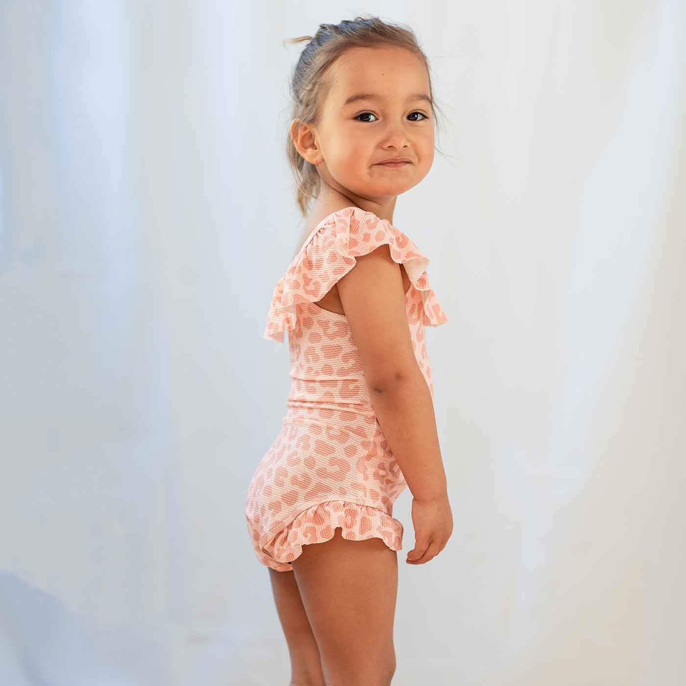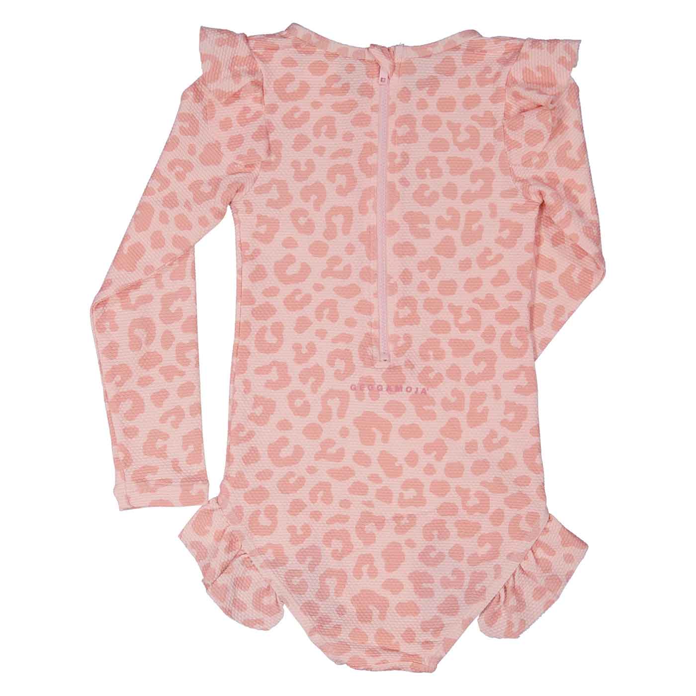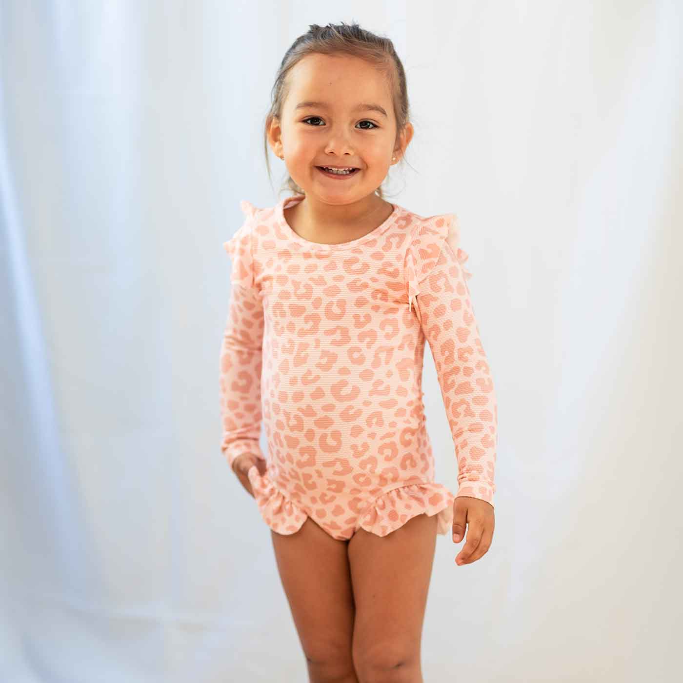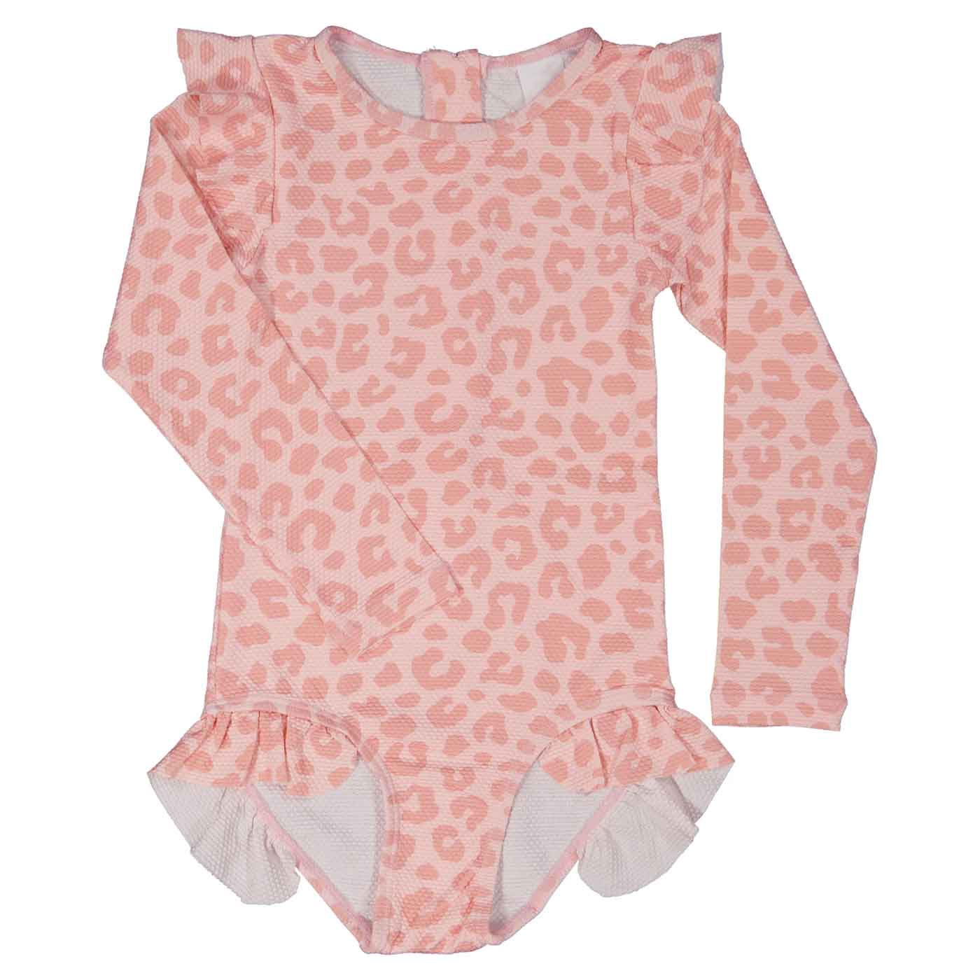 En söt leopardmönstrad baddräkt för alla somriga stunder i vattnet! Baddräkten har långa ärmar och UV-skydd UPF 50+ som blockerar upp till 98 % av solens skadliga UVA- och UVB-strålar, perfekt för soliga dagar i trädgården eller på stranden.