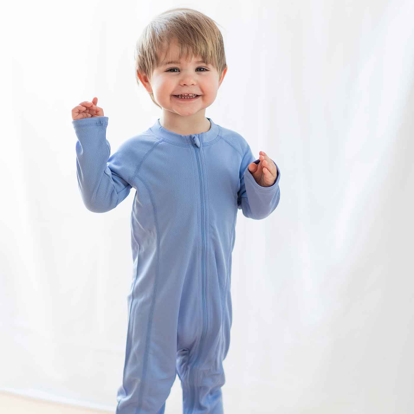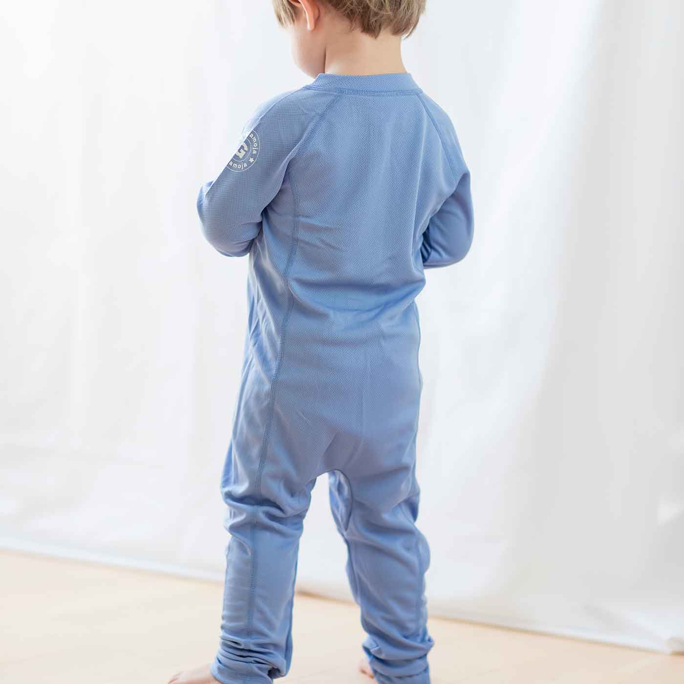 Geggamoja UV-Dräkt Blå är en blå UV-dräkt med hellånga ärmar och ben, som skyddar ditt barn från solens starka strålar på stranden eller vid poolen. Den långa dragkedjan framtill underlättar på- och avklädnad.