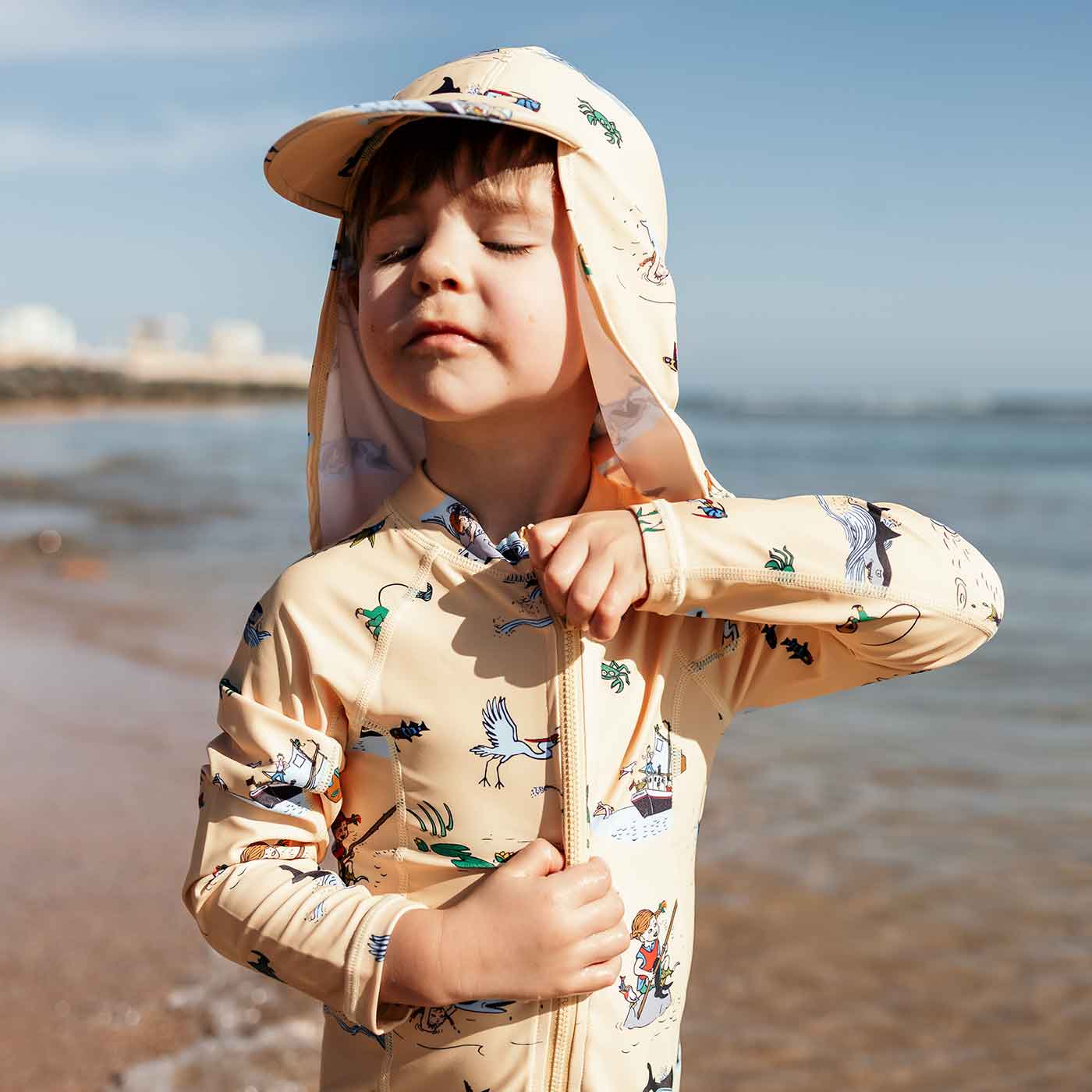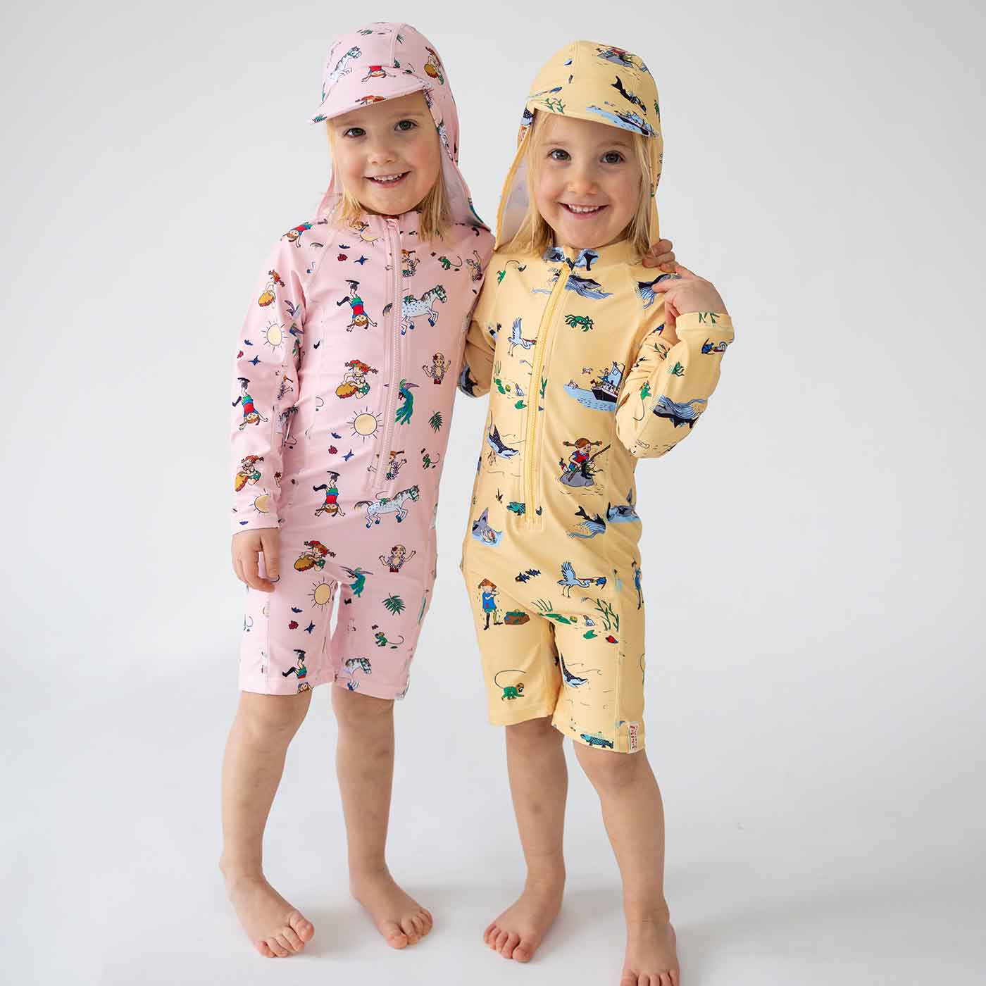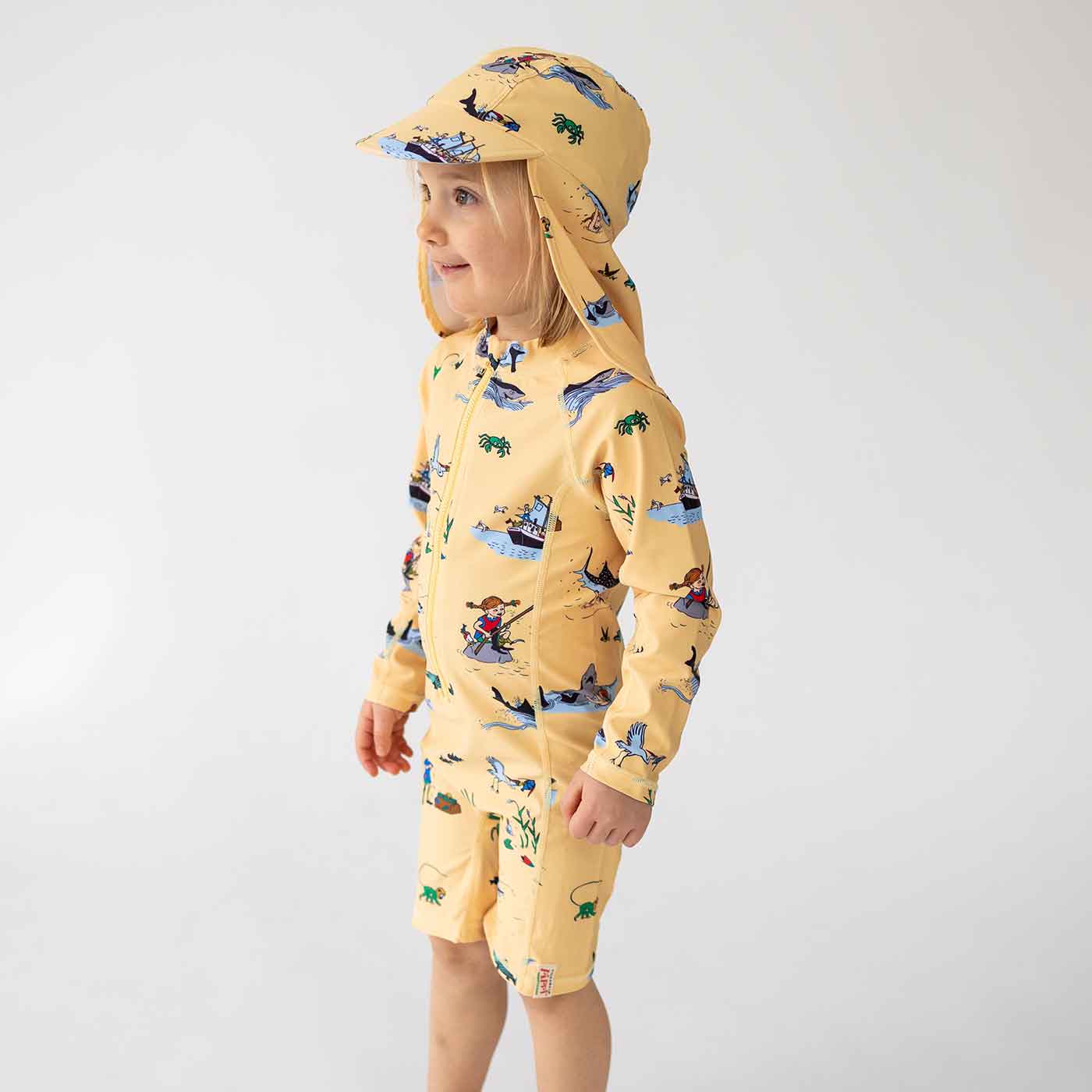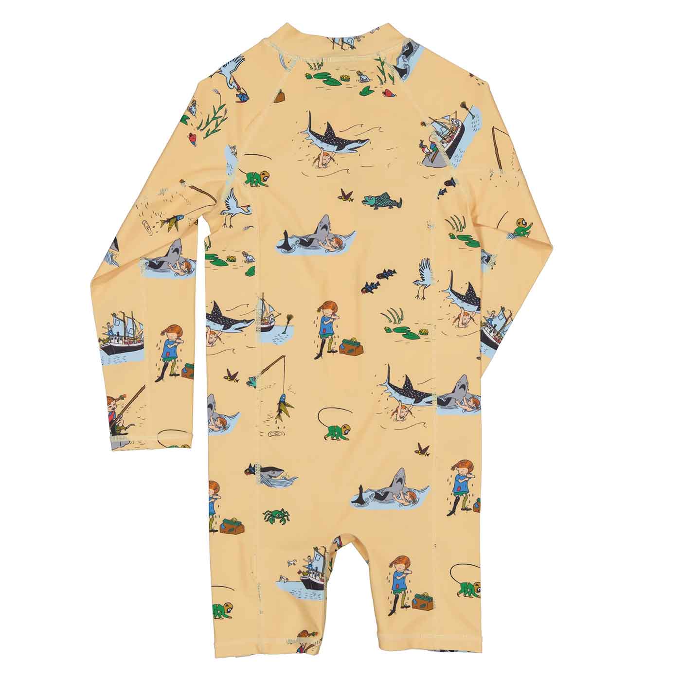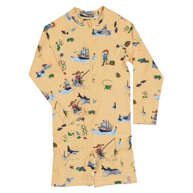 Geggamoja UV-Dräkt Pippi Långstrump Gul är en UV-dräkt med hellånga ärmar och korta ben, som skyddar ditt barn från solens starka strålar på stranden eller vid poolen. Den långa dragkedjan framtill underlättar på- och avklädnad.
