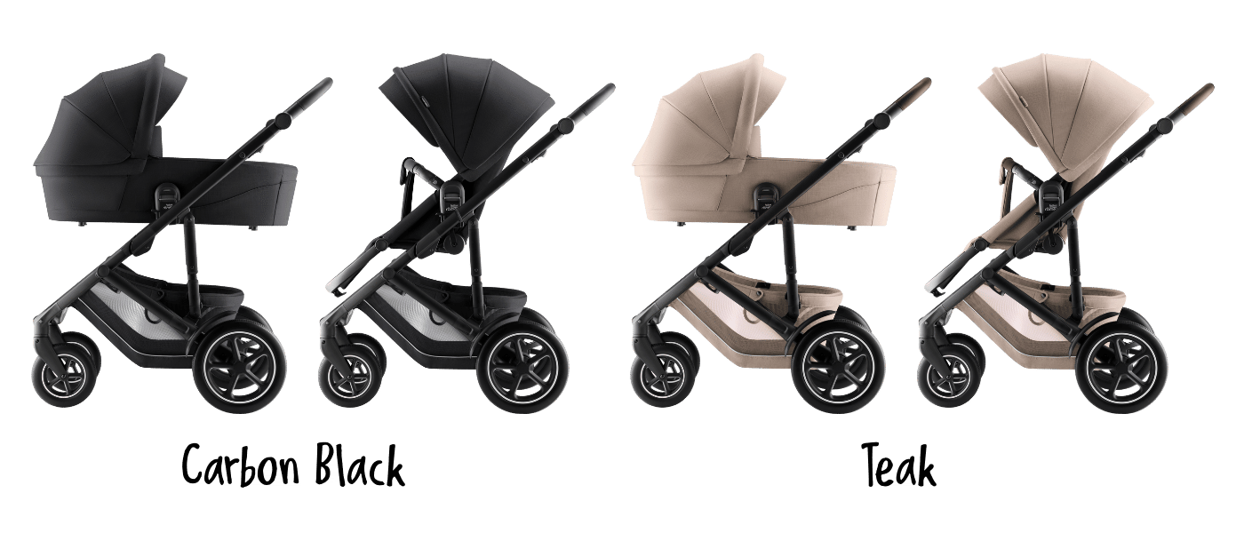Och äntligen får vi en ”all black” Britax Smile i färgen Carbon Black! Den har, inte helt otippat, svart tyg, svart chassi och svarta leatherette-detaljer.