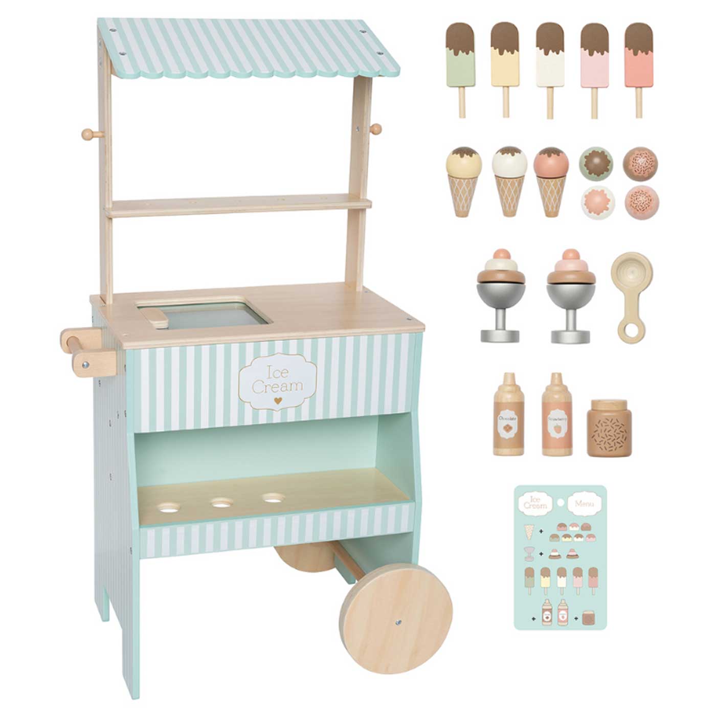 Glasskiosken har en härligt blå- och vitrandig design och är utrustad med frysdel, glasskopor och flaskor med topping. Tack vare de stora hjulen kan kiosken enkelt flyttas dit barnen vill ha sin försäljning – perfekt för lek både inne och ute.