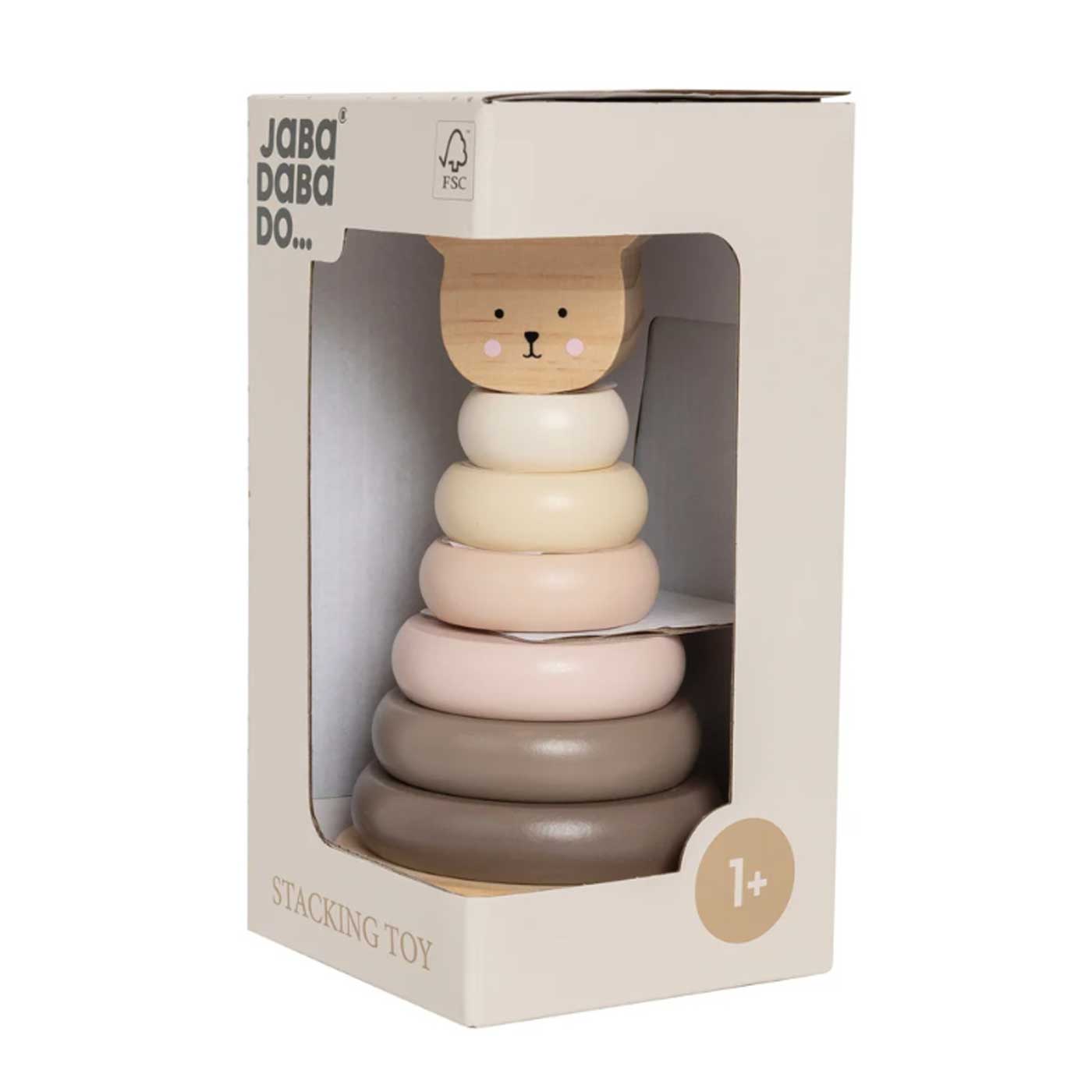 Jabadabado Stapeltorn Teddy Natur består av en stadig bottenplatta med en pinne i mitten. För extra säkerhet sitter pinnen fast med ett flexibelt gummiband, vilket gör den både hållbar och trygg för små barnhänder.