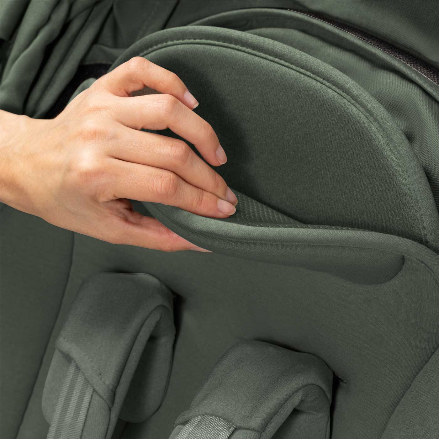Dynan är vändbar med ventilerande 3D-mesh på ena sidan och mjuk bambuviskos på andra, vilket gör det enkelt att anpassa och reglera temperaturen efter årstid. Den vadderade och ergonomiskt formade designen gör att barnet åker bekvämt under varje promenad.