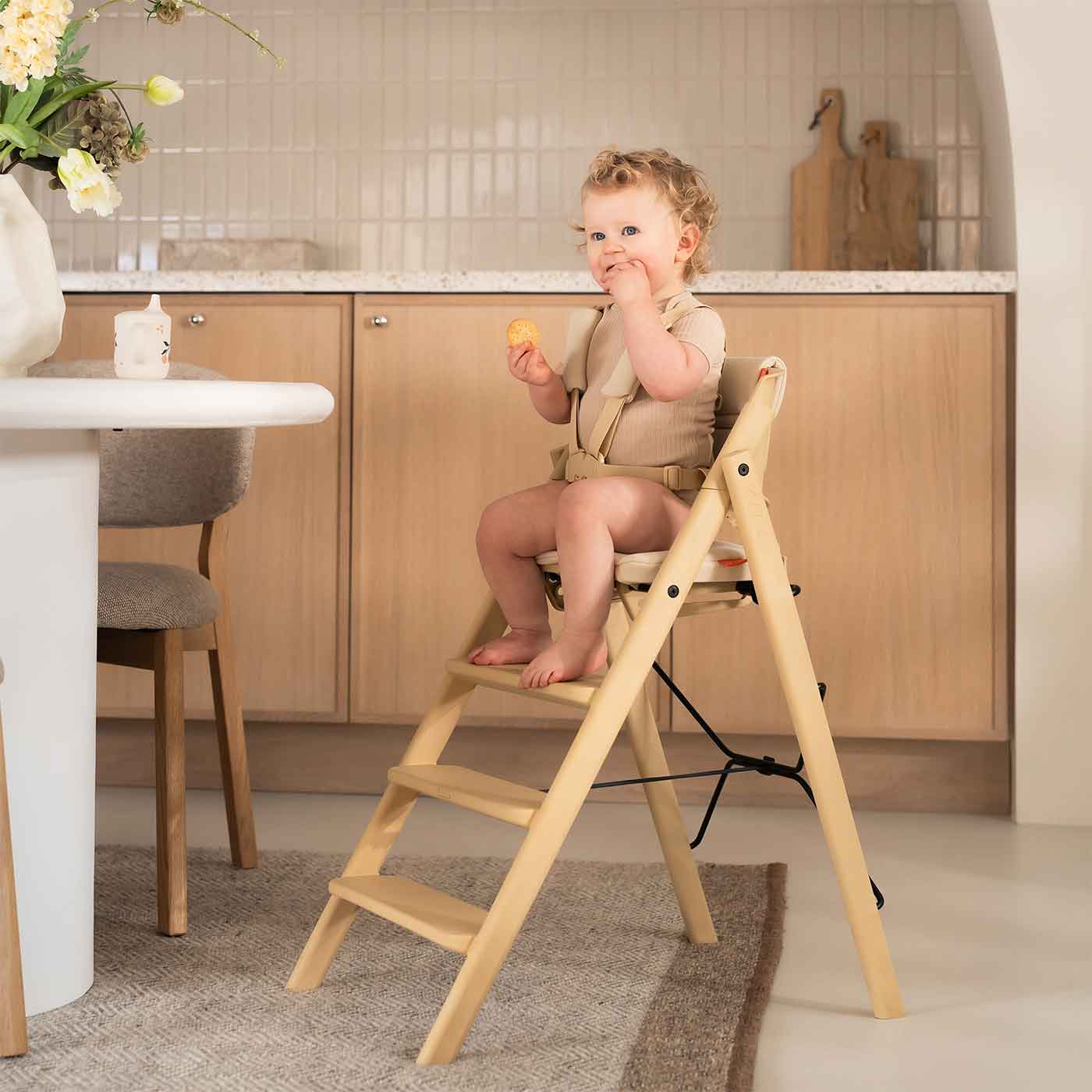 KAOS Klapp Sele och Dyna Desert Sand är ett stilrent och funktionellt tillbehör som ger extra komfort och trygghet vid matbordet. Den vadderade dynan ger mjukt stöd för både rygg och sits, medan den justerbara selen hjälper barnet att sitta säkert utan att kännas begränsande. Setet passar alla KAOS matstolar och dynorna kan användas med eller utan KAOS bygel.