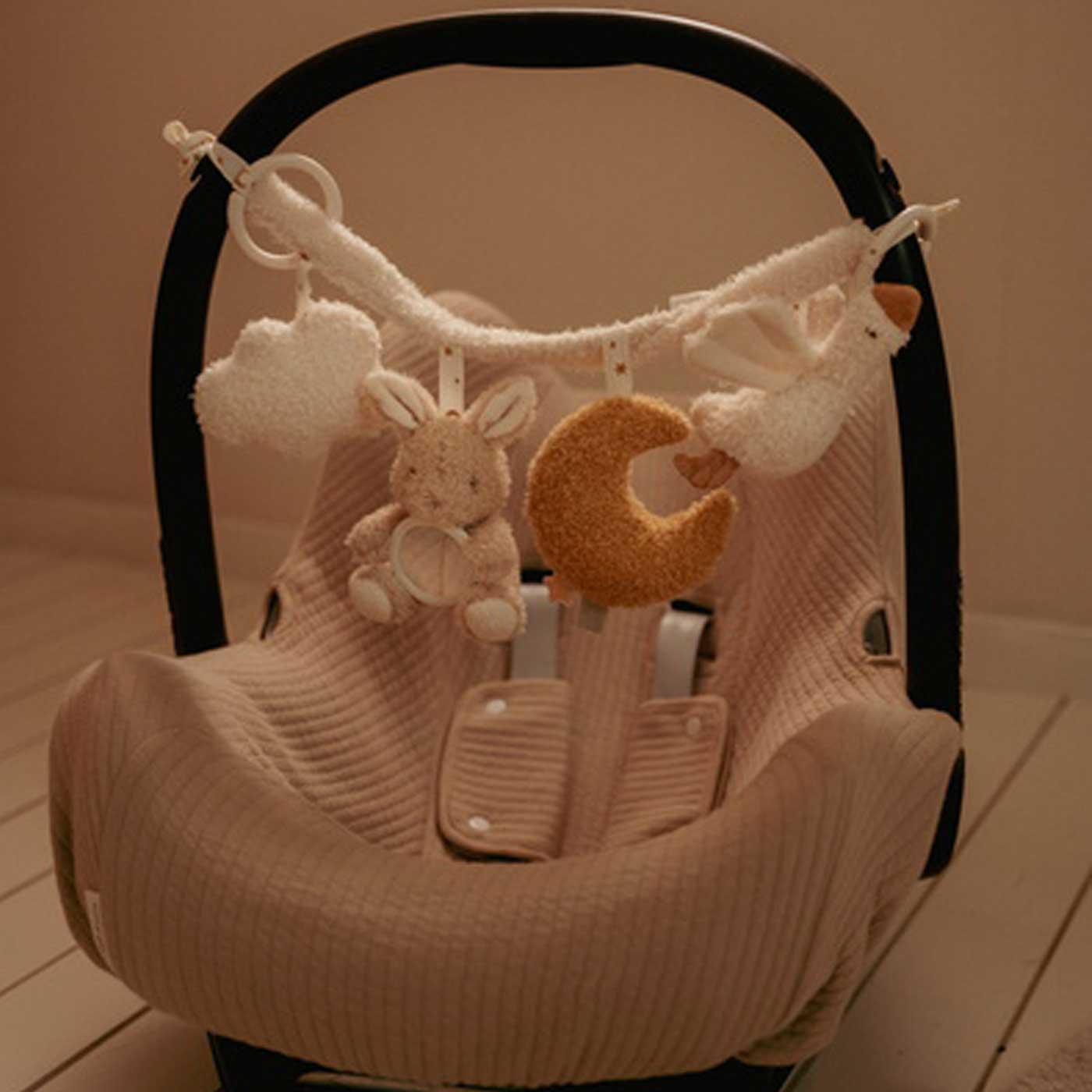 Barnvagnshänget fästs enkelt på vagnen och blir en trygg liten kompis under färden. De lena materialen och de dämpade färgerna är behagliga för små händer att greppa, samtidigt som de bidrar till en mjuk och stilren look.