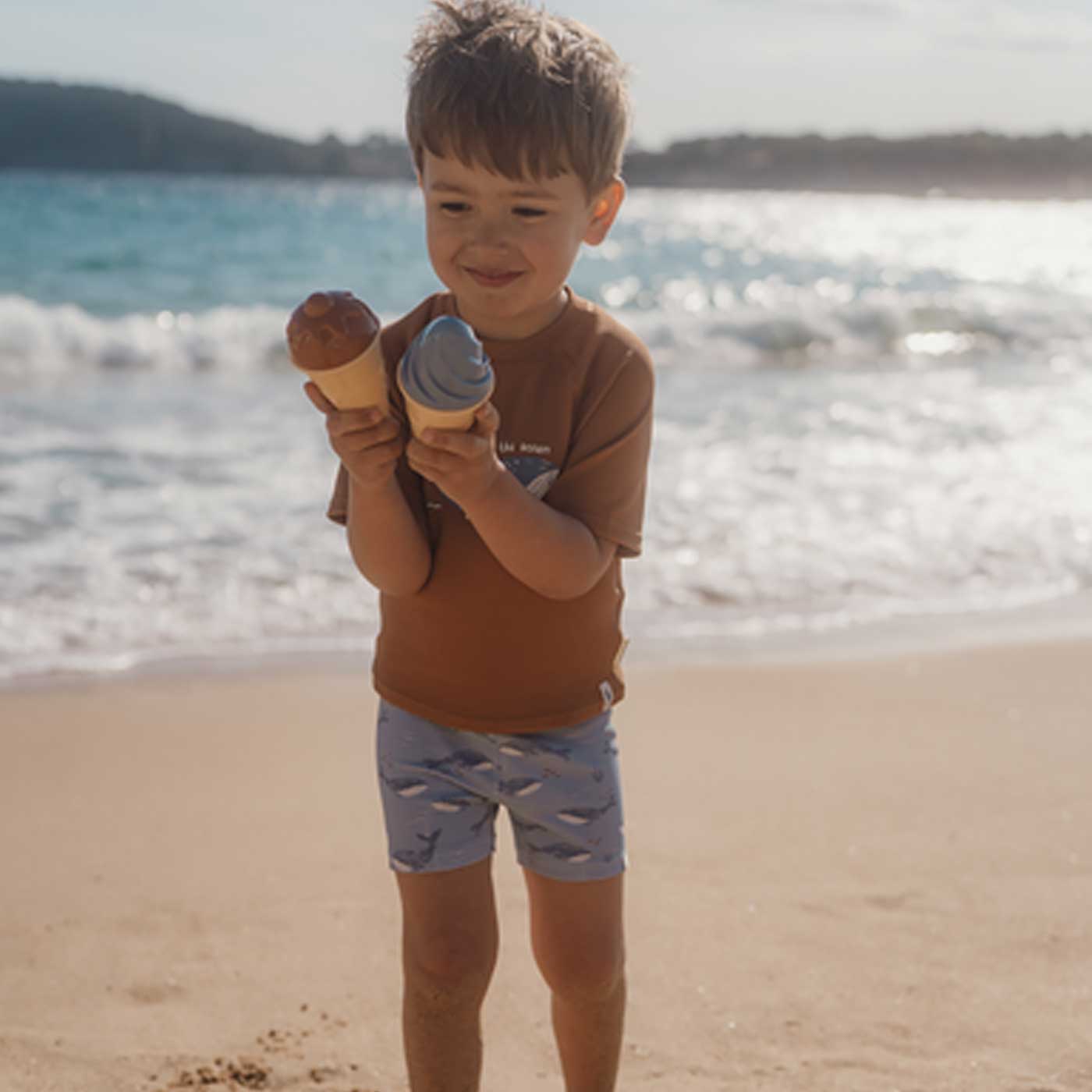 Ett fint hinkset med glassar från Little Dutch med motivet Ocean World. Det blåa hinksetet gör det enkelt för barn att bygga, forma och “servera” sina egna glassar i sanden. Perfekt för rollek och kreativt skapande på stranden, i sandlådan eller i trädgården.