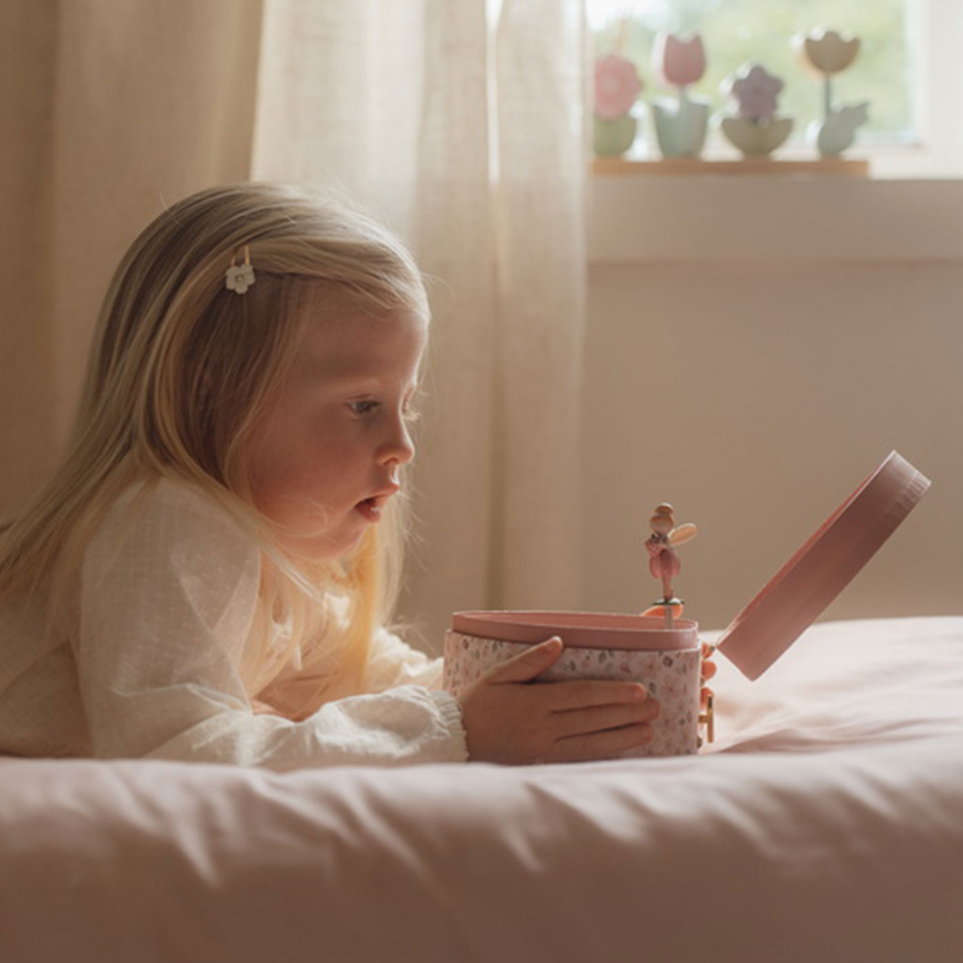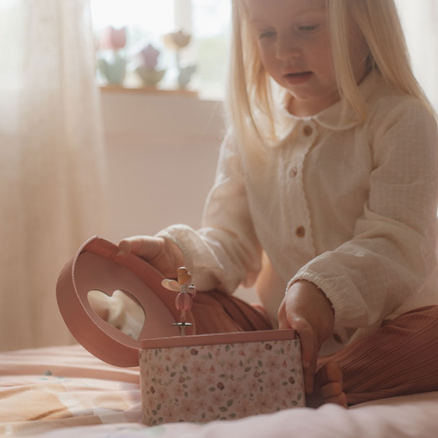 Låt barnrummet fyllas av förtrollning med det hjärtformade Little Dutch Smyckeskrinet Rosa Fairy Garden. När locket öppnas spelas en vacker melodi och en liten älva dansar framför spegeln – en klassisk detalj som fångar barnets blick och väcker fantasin.