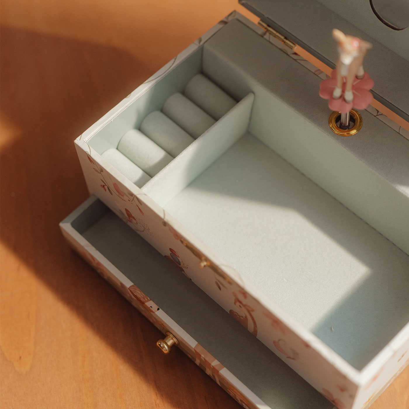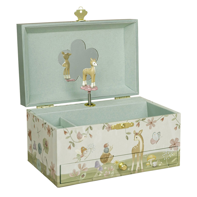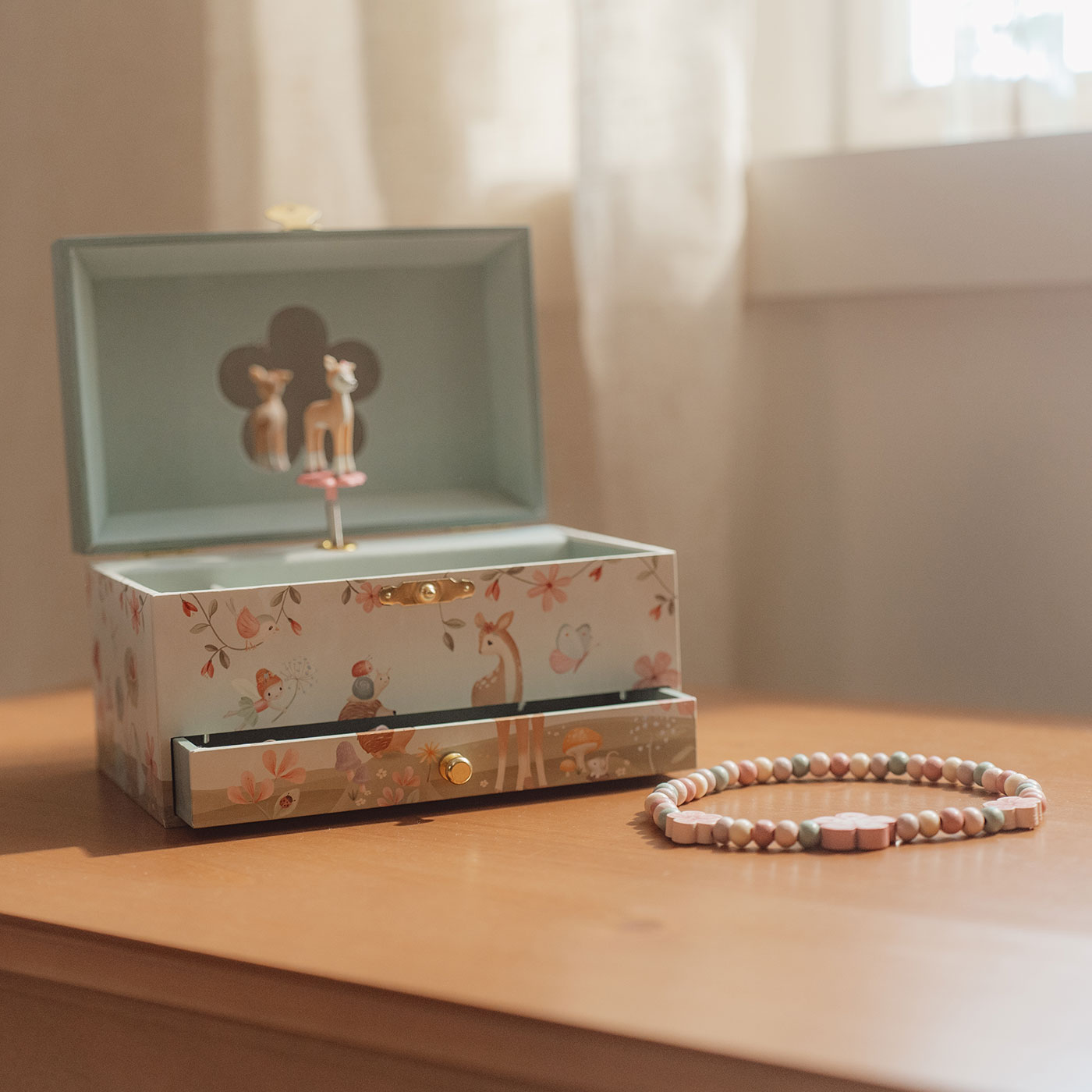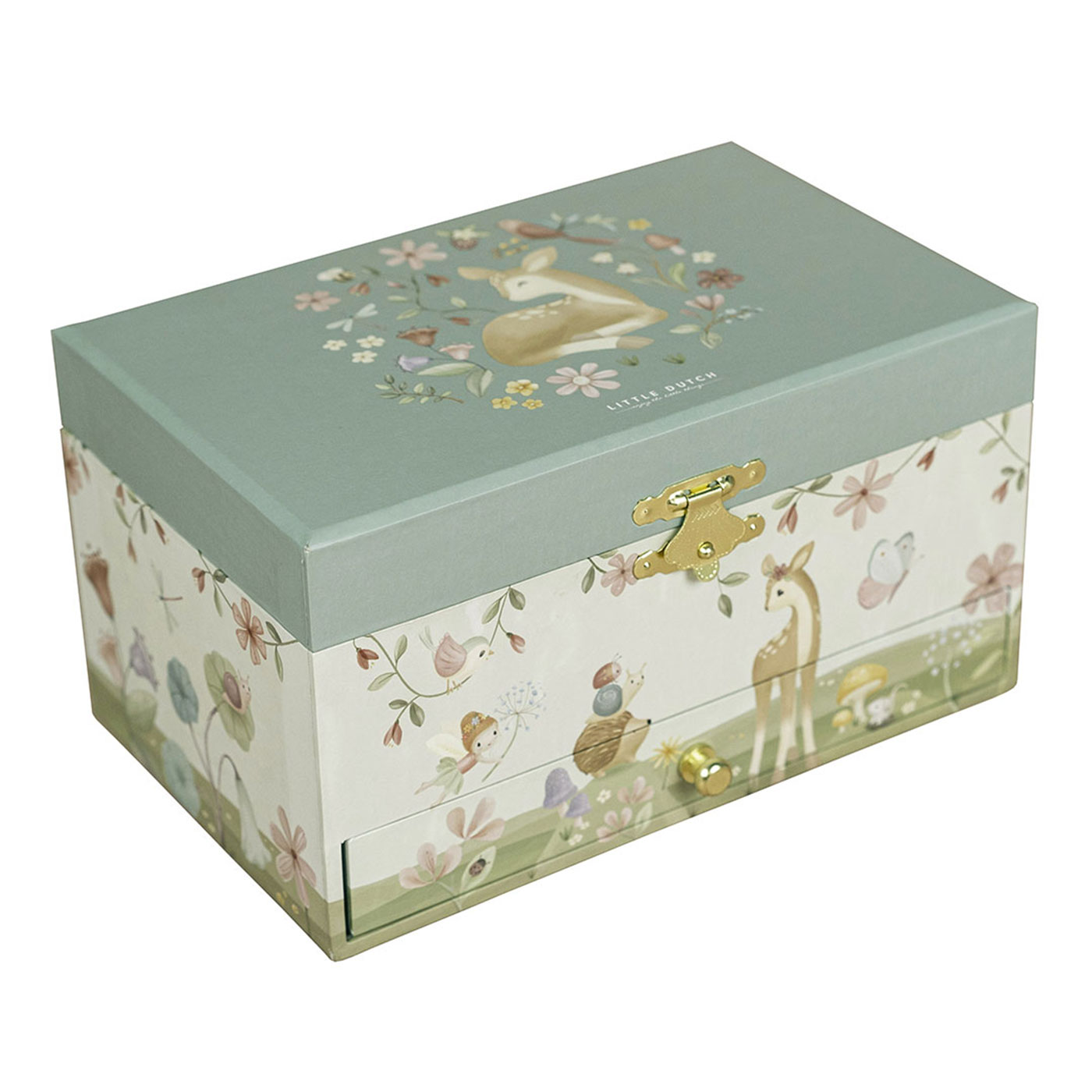 Skapa en förtrollande plats i barnrummet med det charmiga Little Dutch Smyckeskrinet Rådjur Forest Friends. När locket öppnas spelas en vacker melodi och ett litet rådjur snurrar framför spegeln – en klassisk detalj som fångar barnets blick och väcker fantasin.