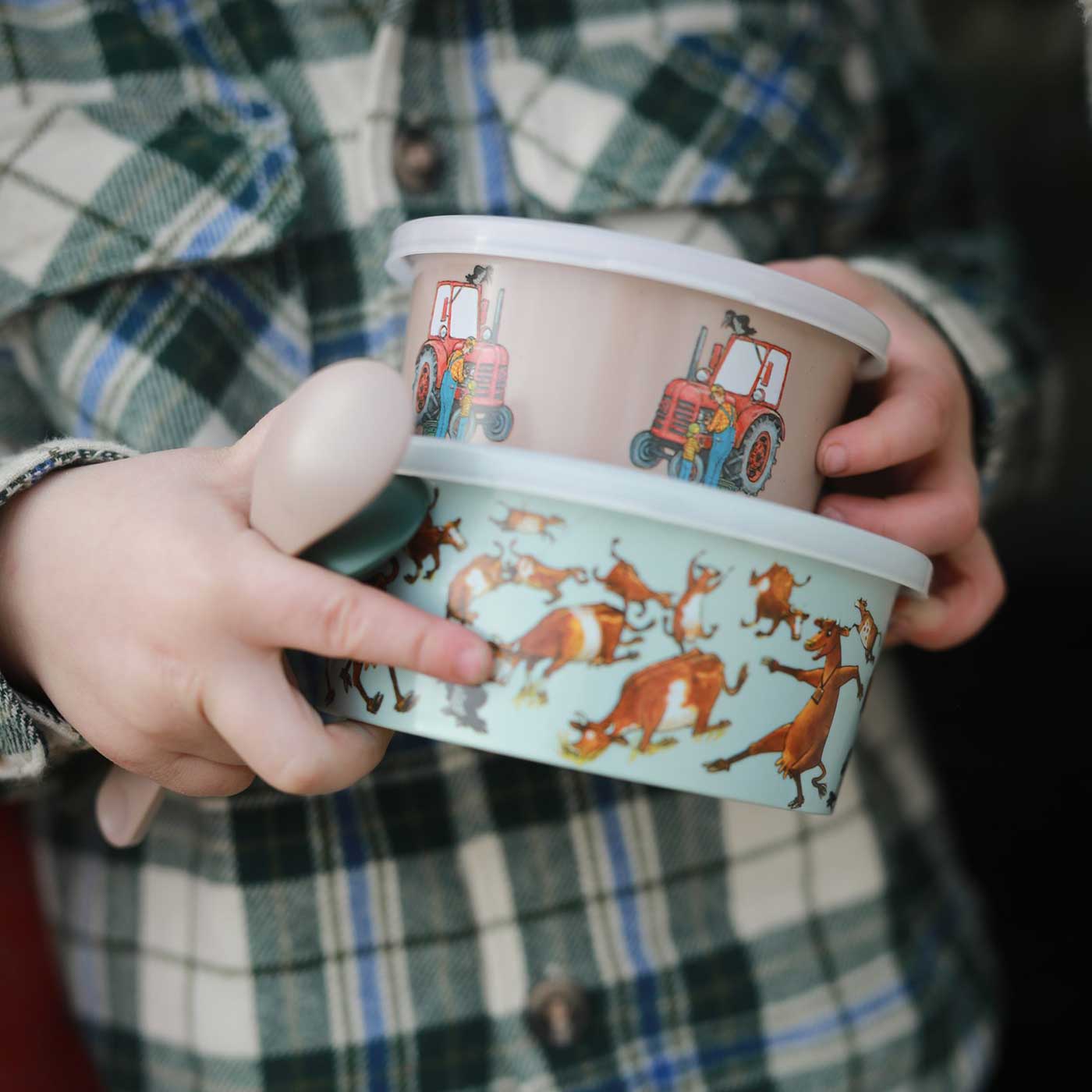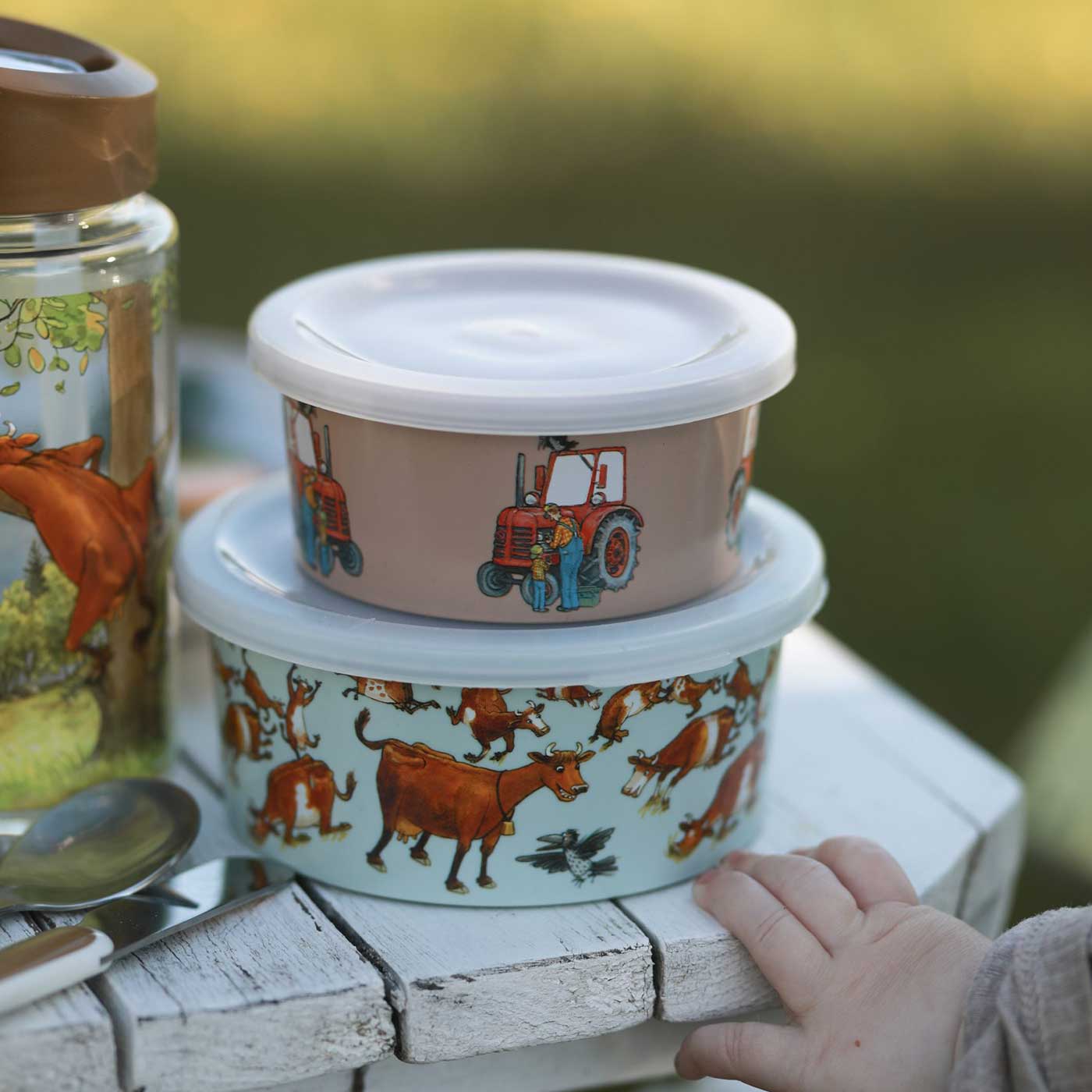 Mamma Mu Snackbox 2-pack är förvaringslådor i två olika storlekar. Locken till lådorna är förslutningsbara och tillverkad i PP-plast. Det finns två olika storlekar, den lilla rymmer 250 ml och stora rymmer 450 ml. Boxarna är tillverkade i RPET som är ett mer hållbart material, produkterna i RPET bidrar till minskat avfall och lägre koldioxidavtryck.
