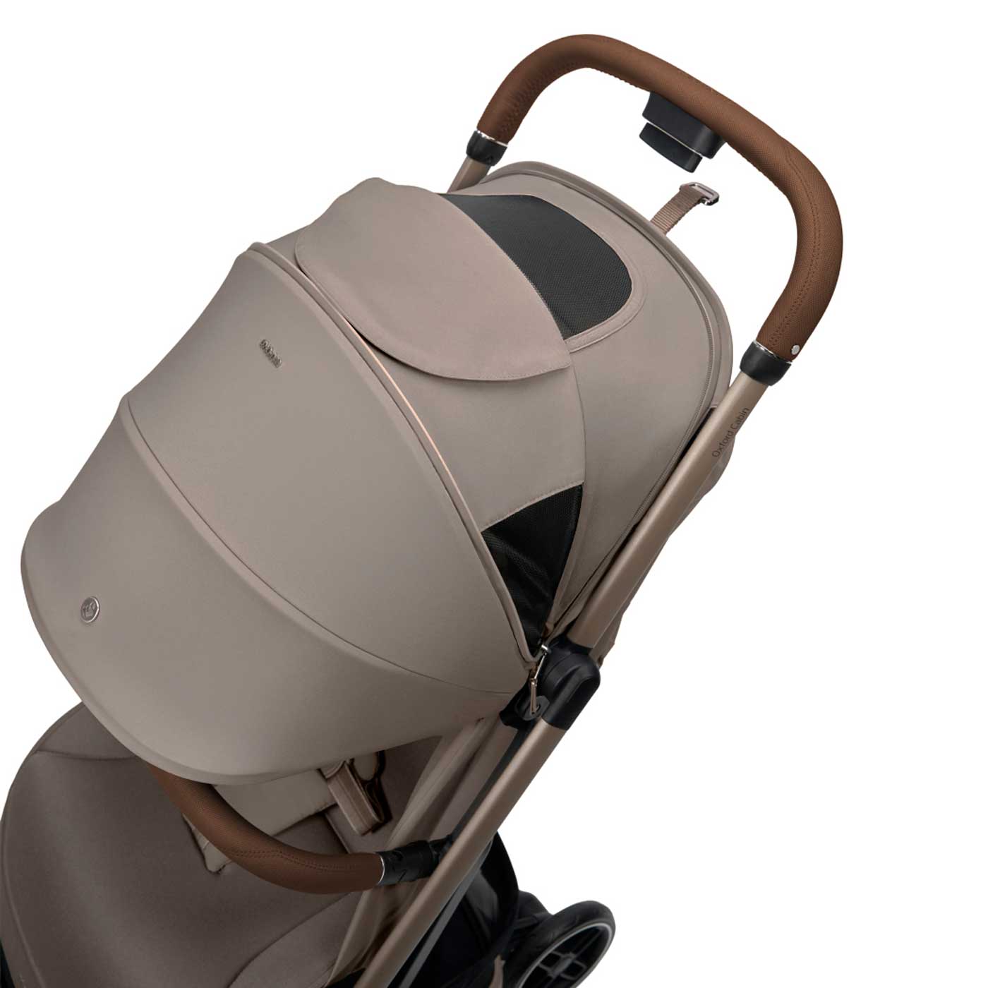 Den generösa, förlängningsbara suffletten ger bra skydd mot sol och vind. Sittdelen har ett fullt, steglöst liggläge vilket gör vagnen bekväm även för vila och tupplurar.