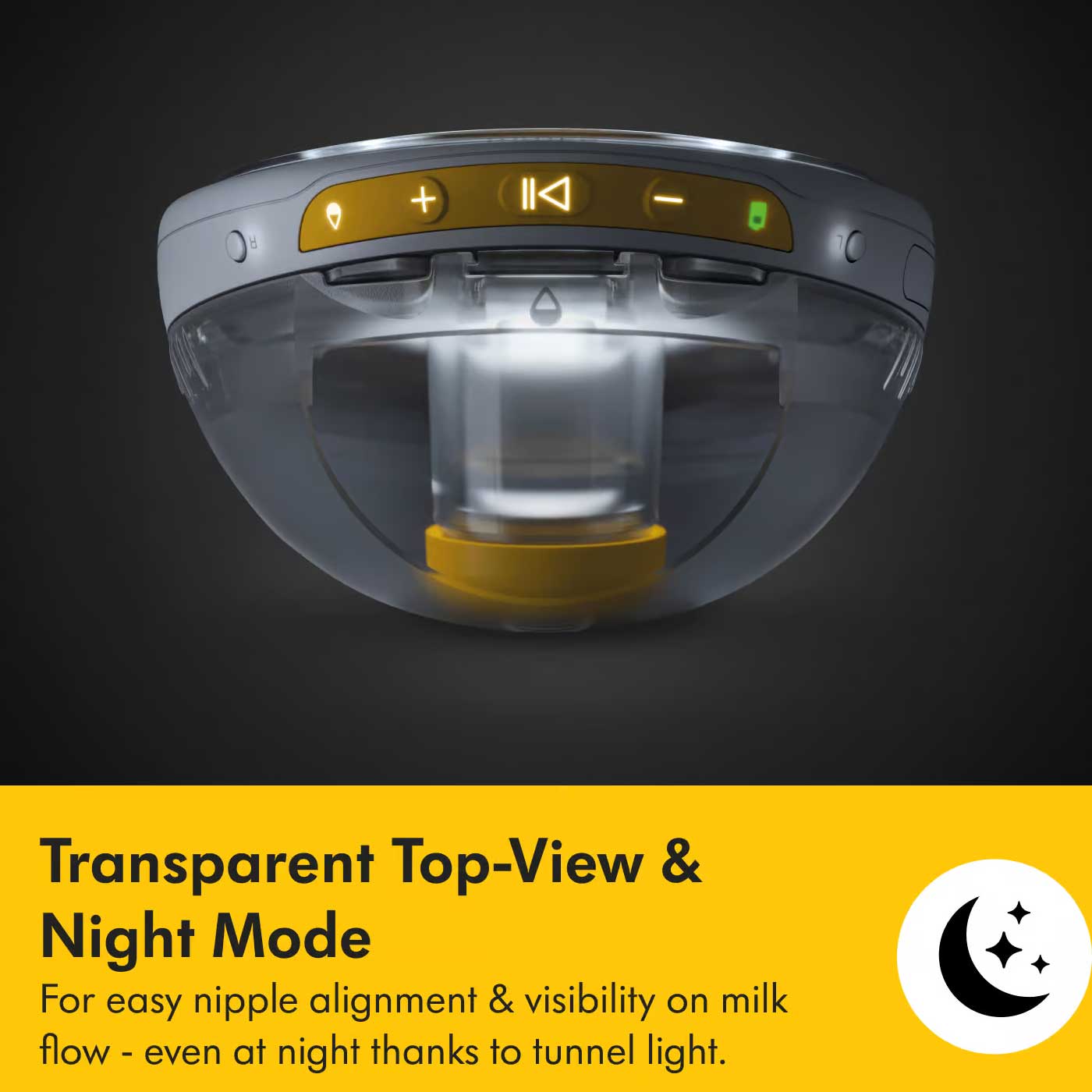 - Genomskinlig toppdesign och nattläge: Gör det enkelt att placera bröstvårtan rätt och följa mjölkflödet, även i mörker tack vare den inbyggda tunnelbelysningen.