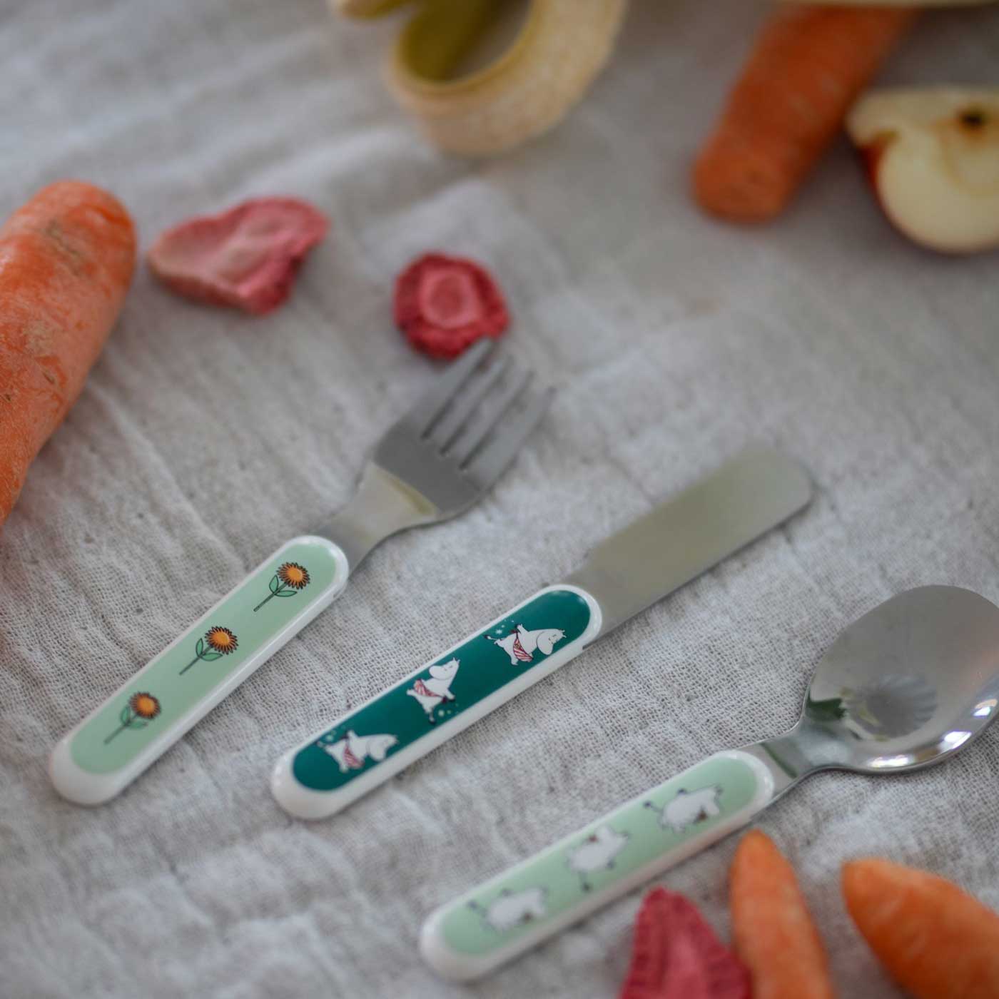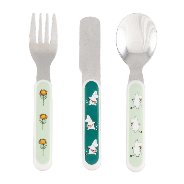 Mumin Äng Barnbestick Grön kommer i tre delar - kniv, gaffel och sked. Besticken är utformade för barnets små händer och mun. De är lätta att greppa och gör det enkelt för barnet att äta själv. Levereras i fin presentask. Matcha gärna med servisen i samma serie.