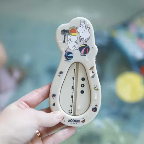 Mumin Badtermometer hjälper dig att kontrollera vattentemperaturen innan badstunden. Placera termometern i vattnet för en tydlig indikation av temperaturen, som bör ligga runt 37 grader för en behaglig badupplevelse.