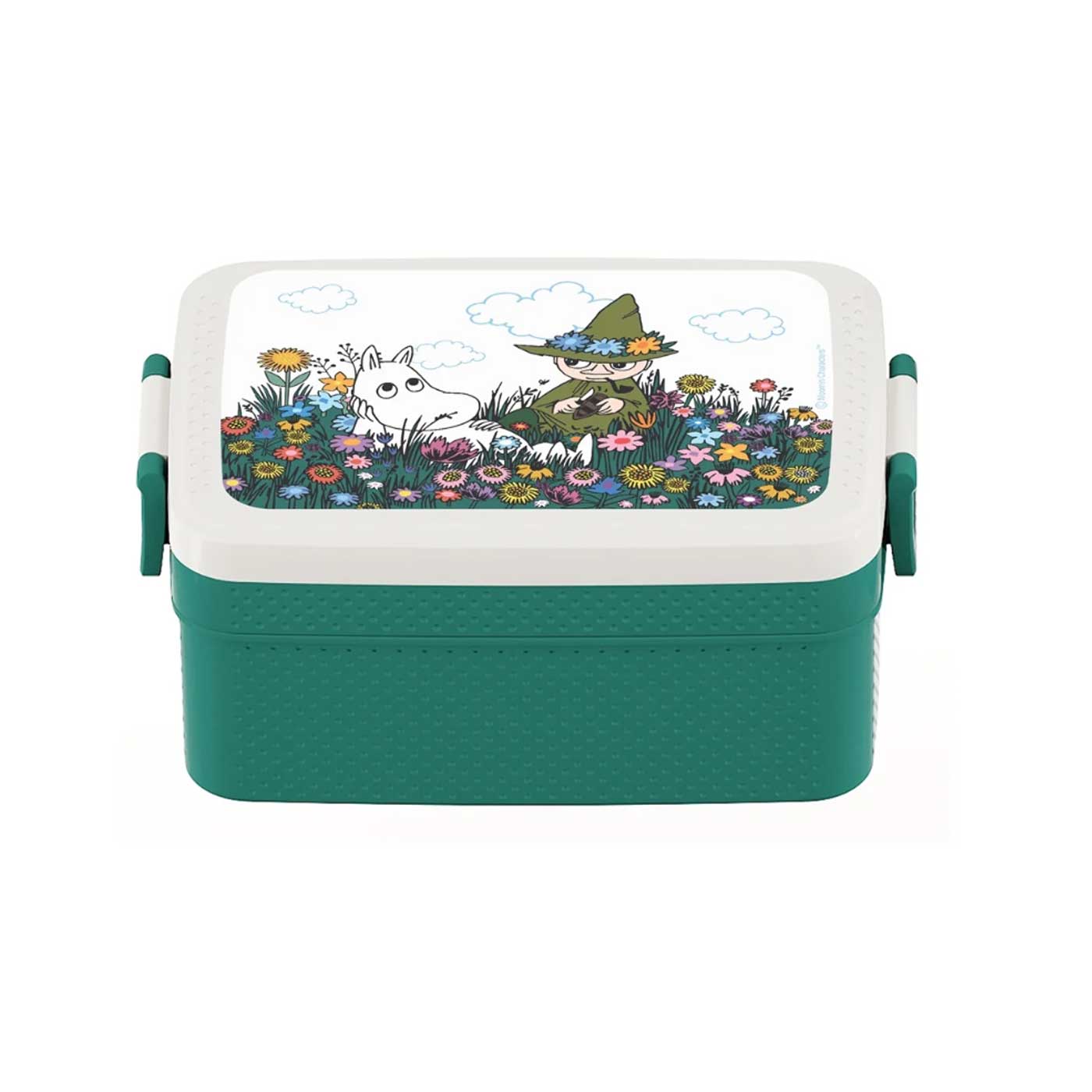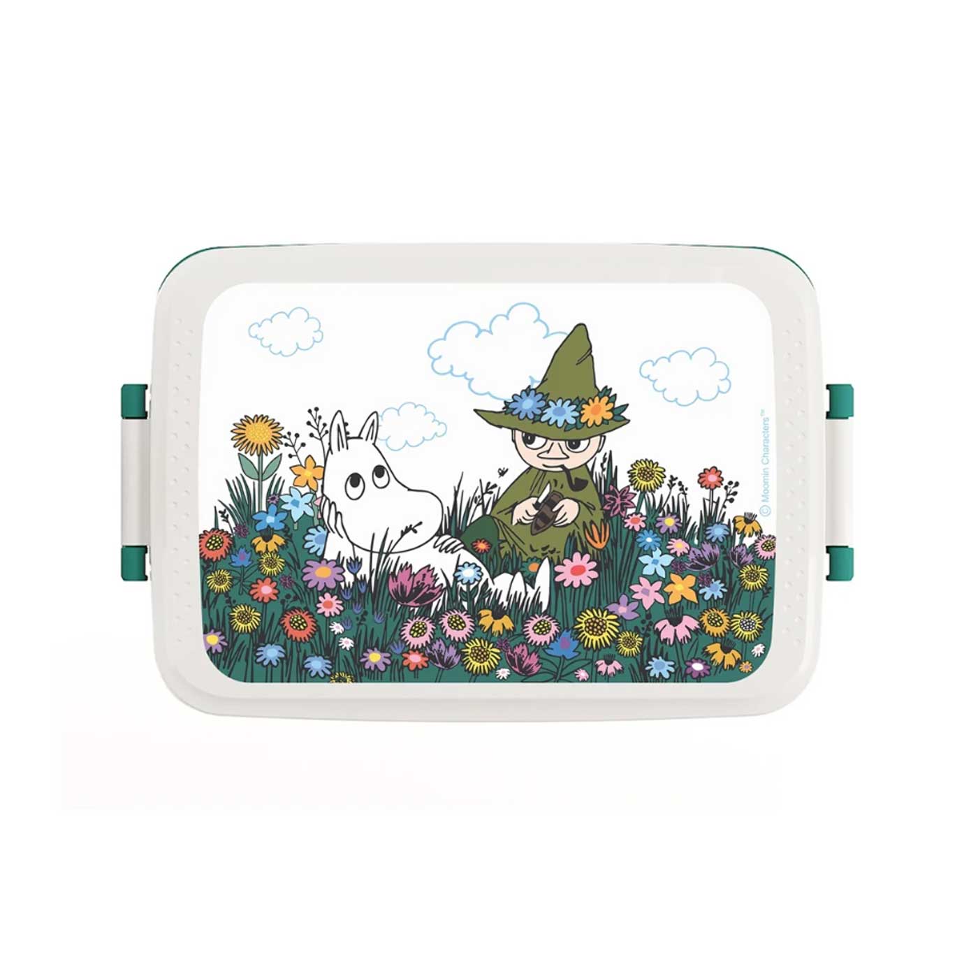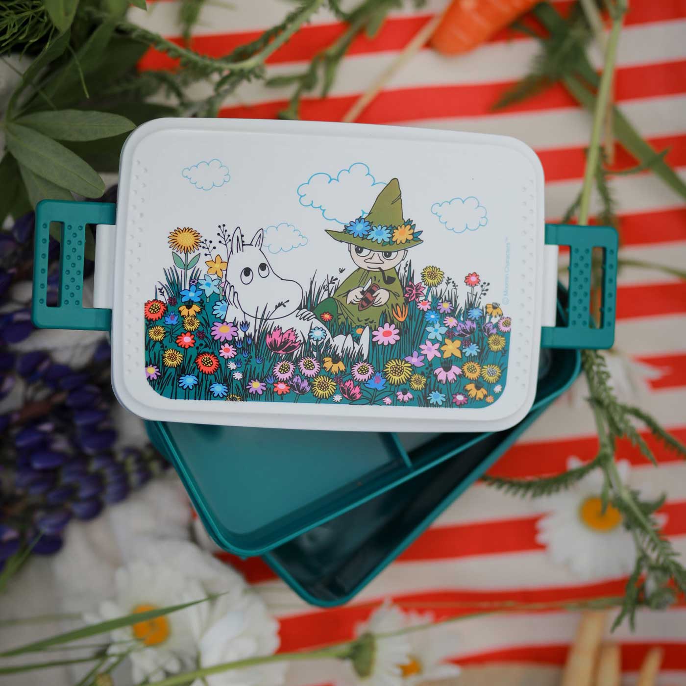 Söt och praktisk lunchlåda i grönt med Mumin på blomstrande äng – perfekt till förskolan, utflykter och mellis på språng.