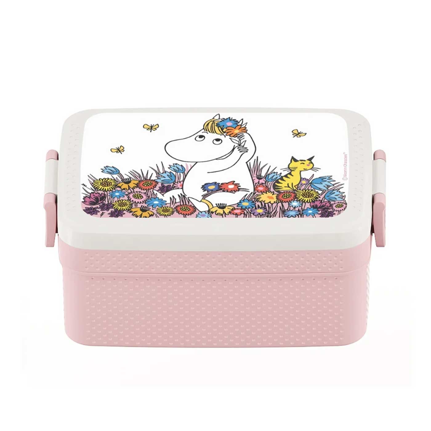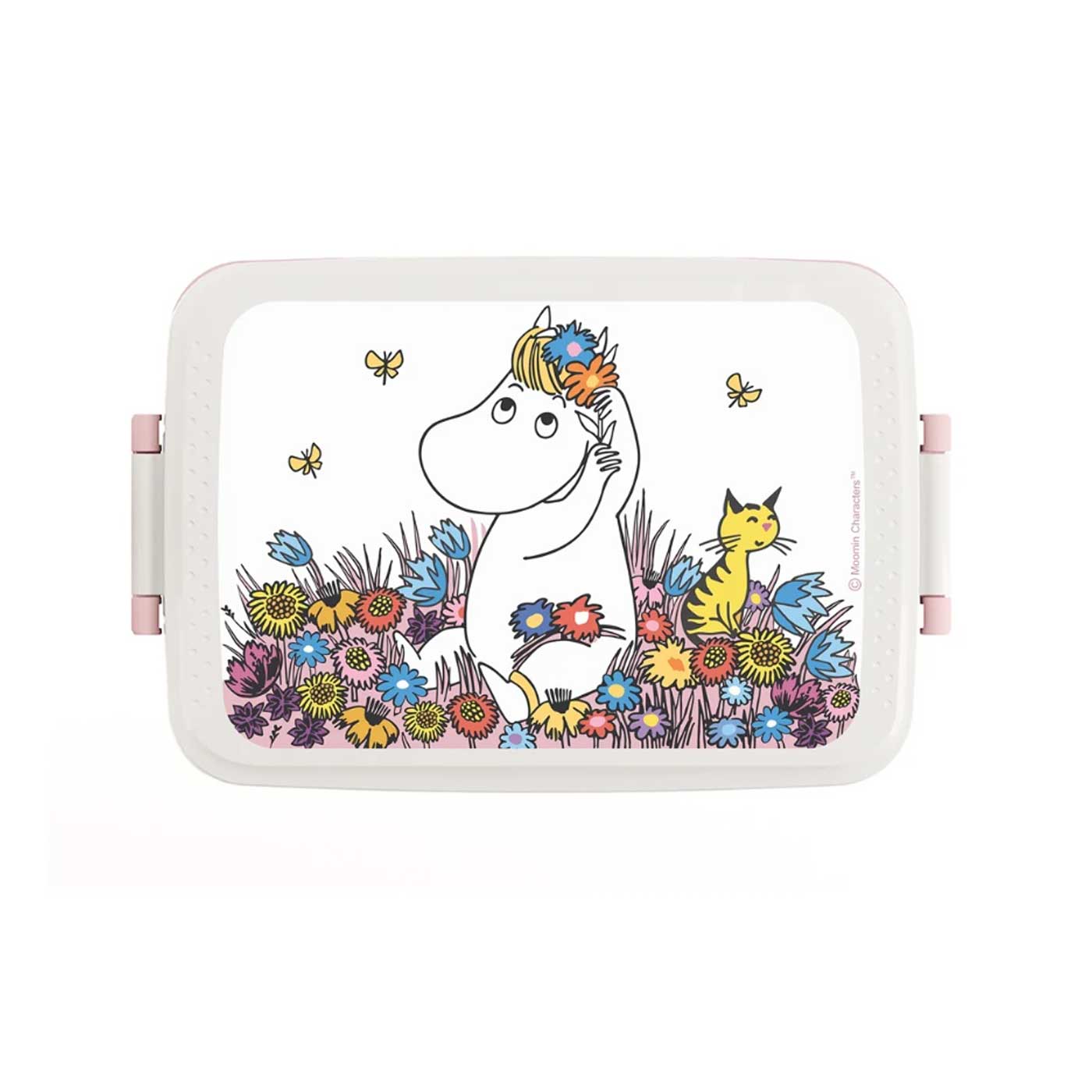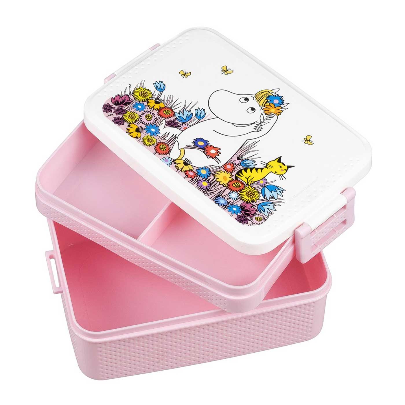 Söt och praktisk lunchlåda i rosa med Mumin på blomstrande äng – perfekt till förskolan, utflykter och mellis på språng.