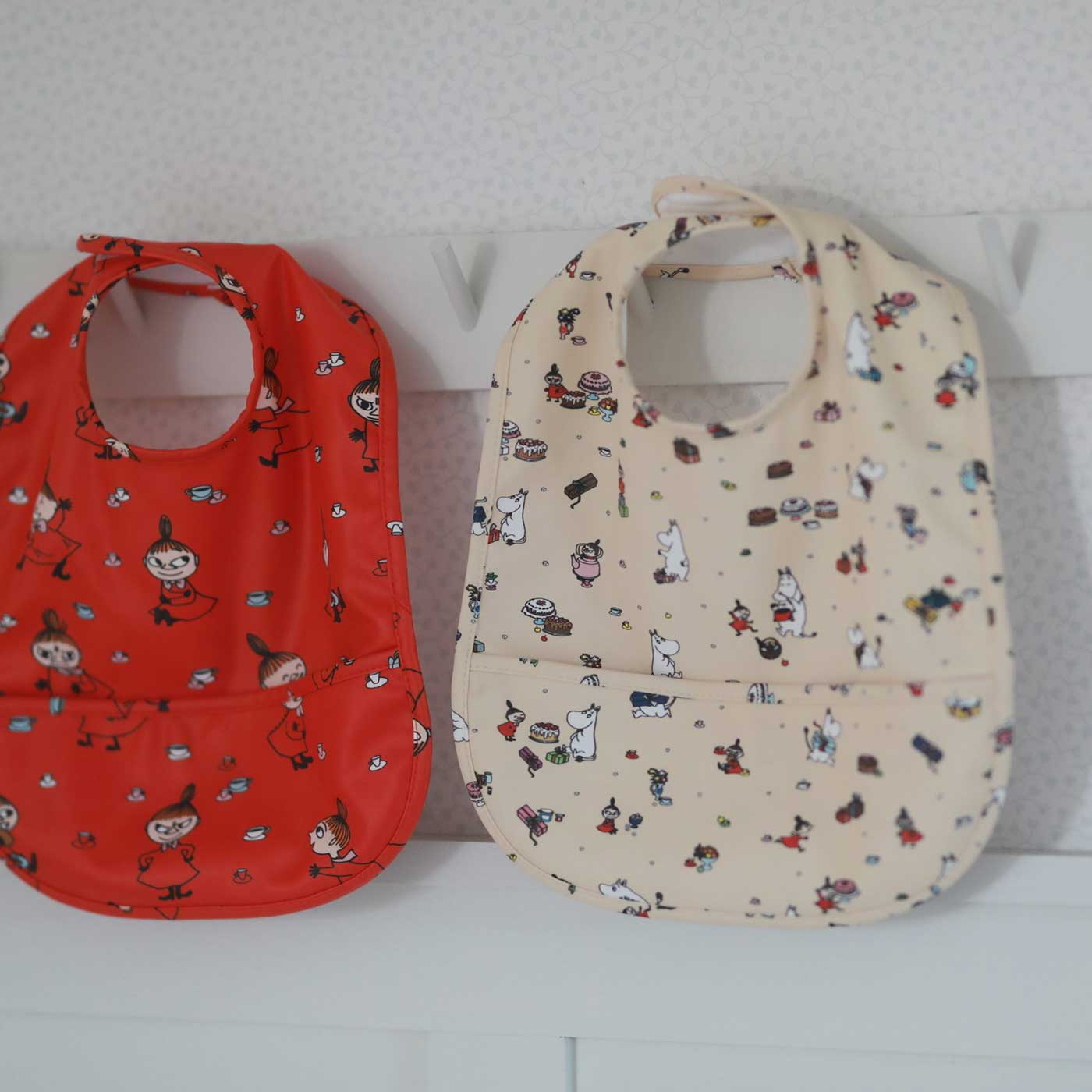 En fin och praktisk haklapp från Rätt Start med motiv i Mumin. Haklappen fästs enkelt med kardborre i nacken och är både vattenavvisande och utrustad med en spillficka på magen. Den skyddar effektivt kläderna mot smuts och spill under måltider.