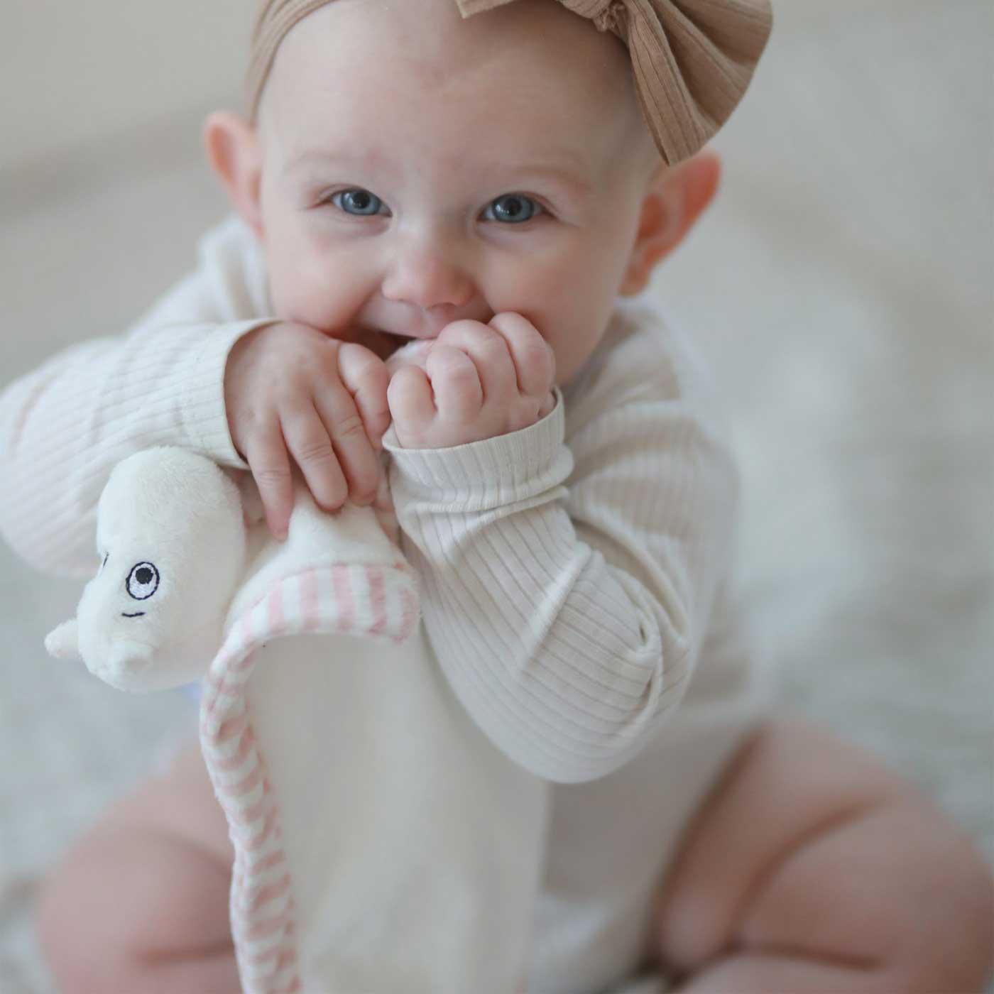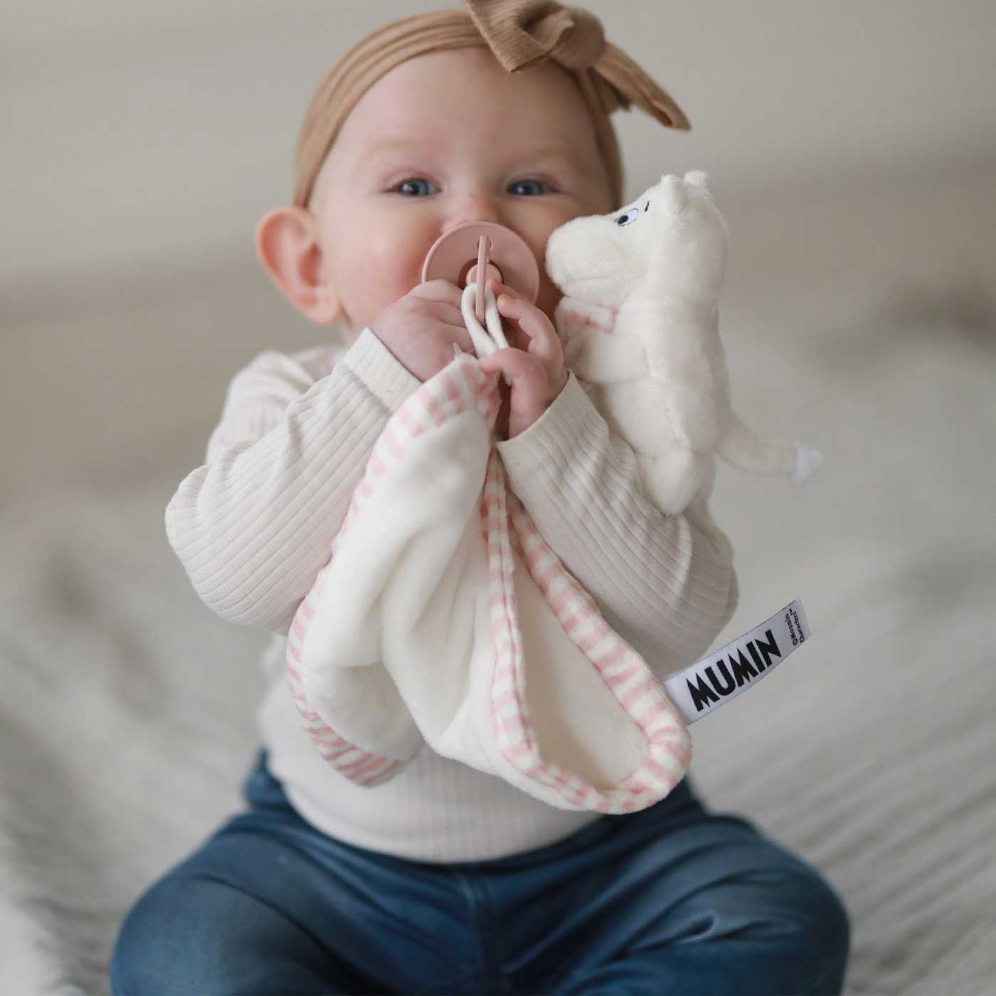 En mjuk och gosig snuttefilt som ger barnet trygghet under dagens alla stunder. Den lilla hållaren gör det enkelt att fästa napp eller bitring, så att favoriten alltid finns nära.