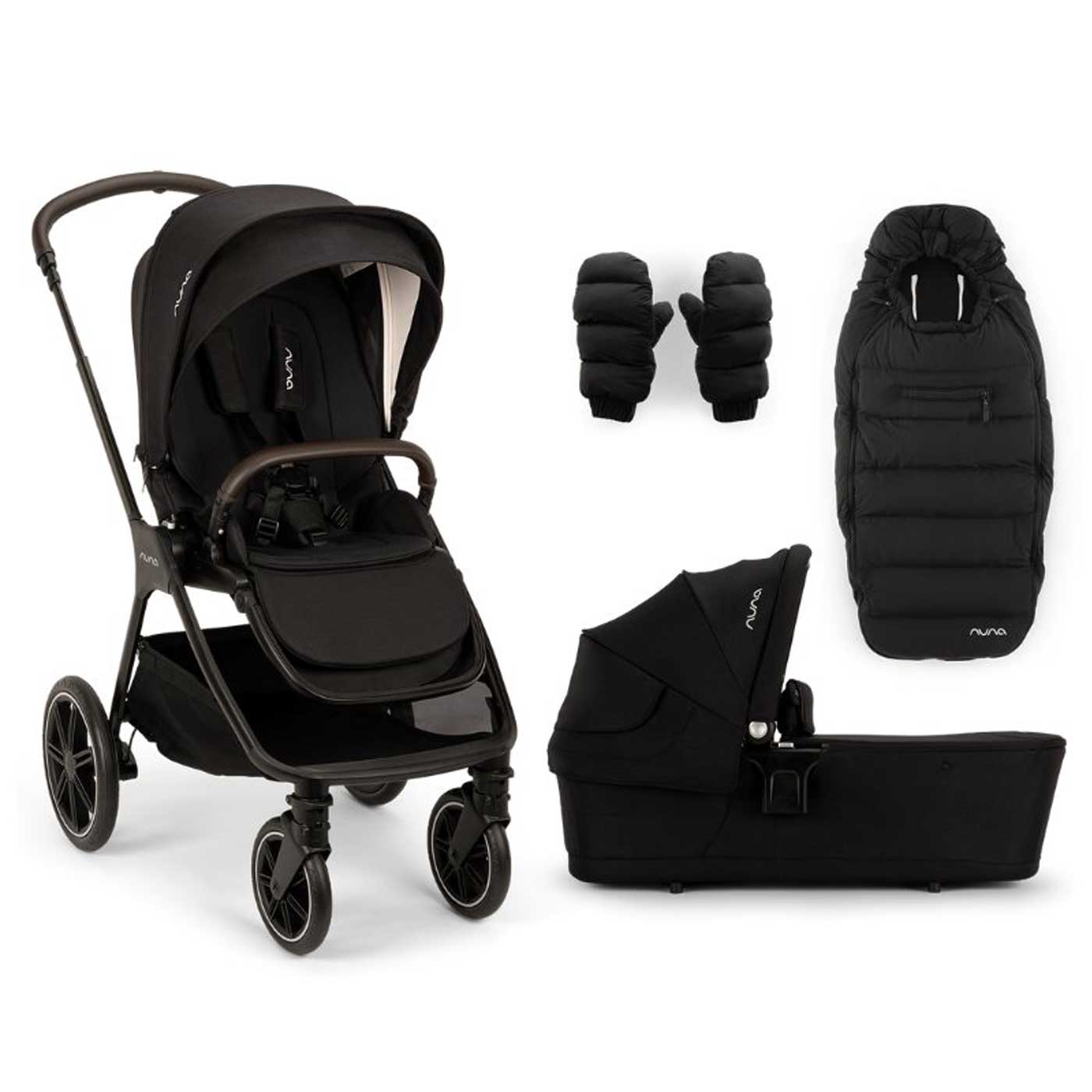 Paketet innehåller även: regnskydd, åkpåse, vagnsdyna i TENCEL™ Lyocell och merinoull, vinterhandskar, swing-away frambåge och adapter för babyskydd.