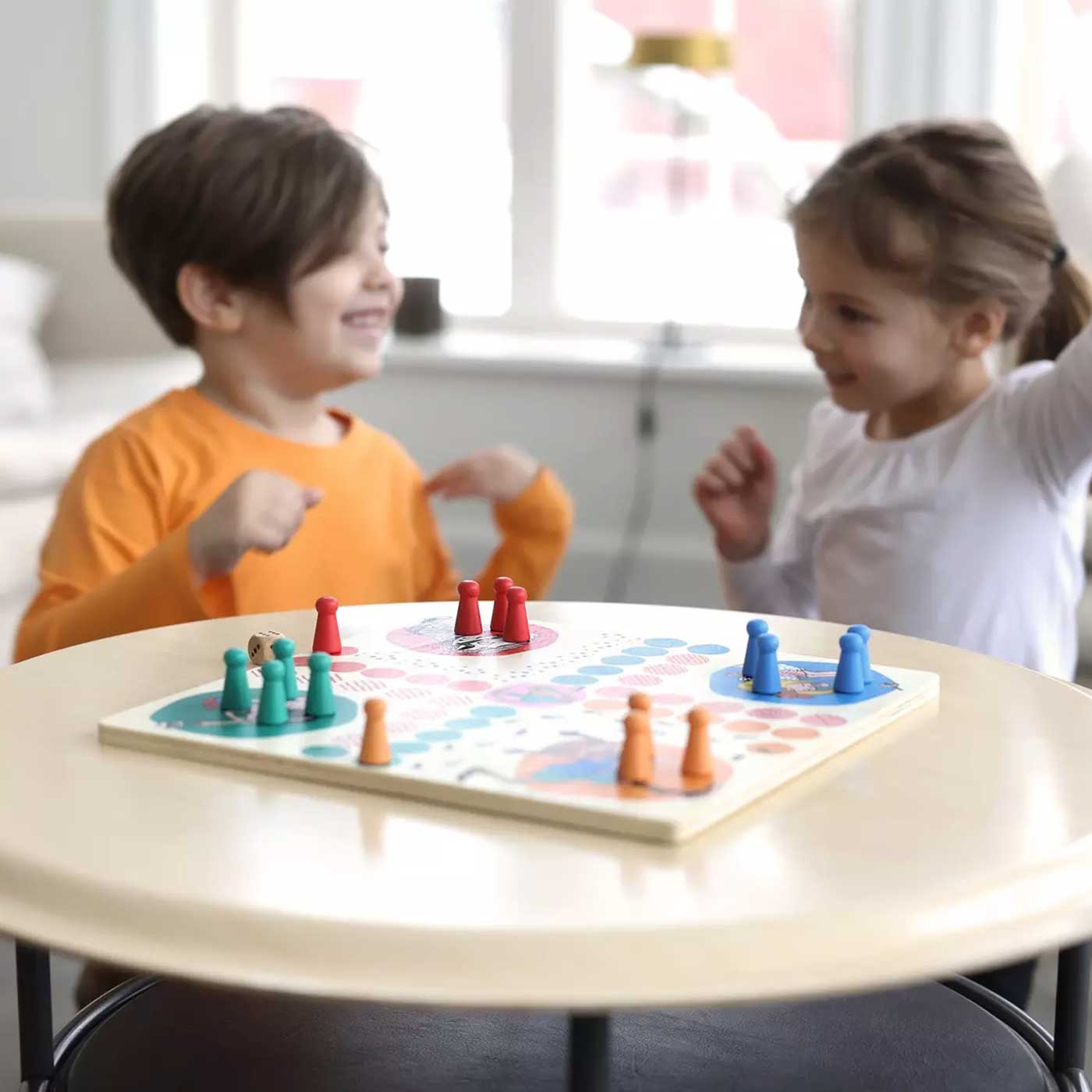 Det klassiska brädspelet är tillverkat i trä och består av: