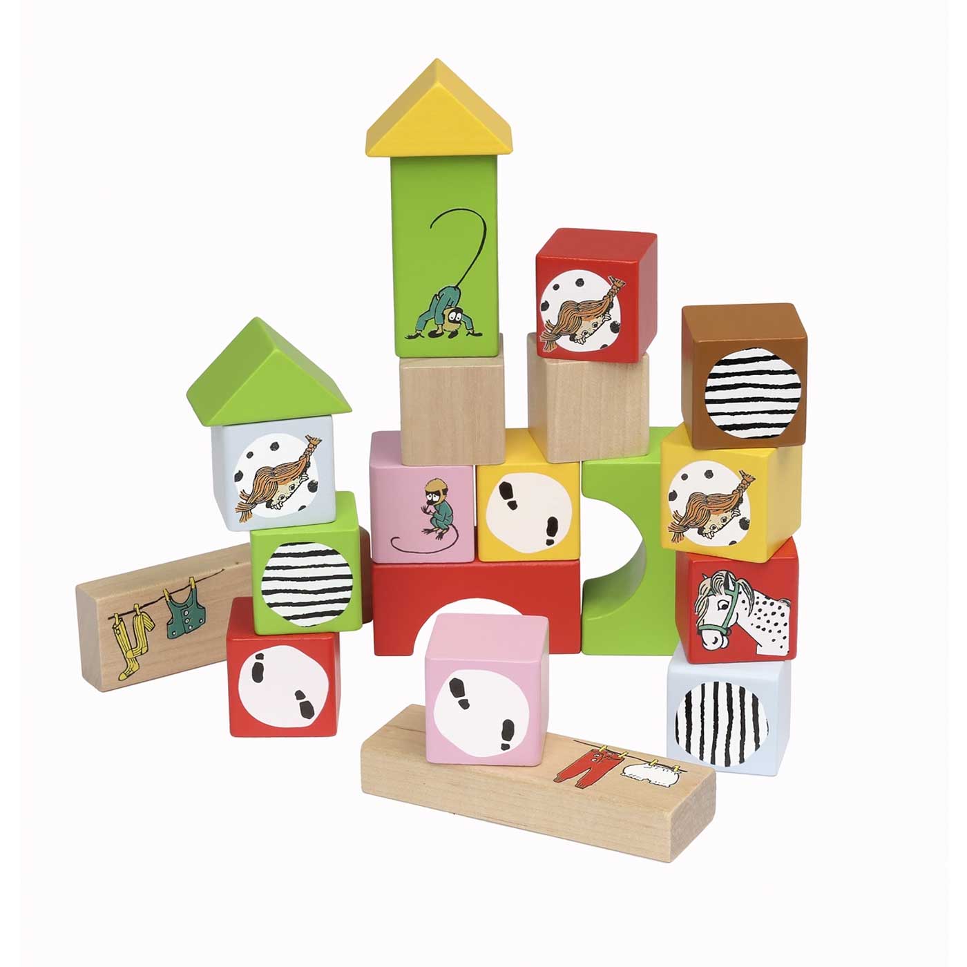 Det klassiska setet med 30 träklossar öppnar upp för oändliga byggmöjligheter. Klossarna är robusta och färgglada, perfekt anpassade för små händer som vill stapla, bygga och experimentera. På ena sidan finns välkända illustrationer av Pippi och hennes vänner som gör varje bygge ännu mer fantasifullt.
