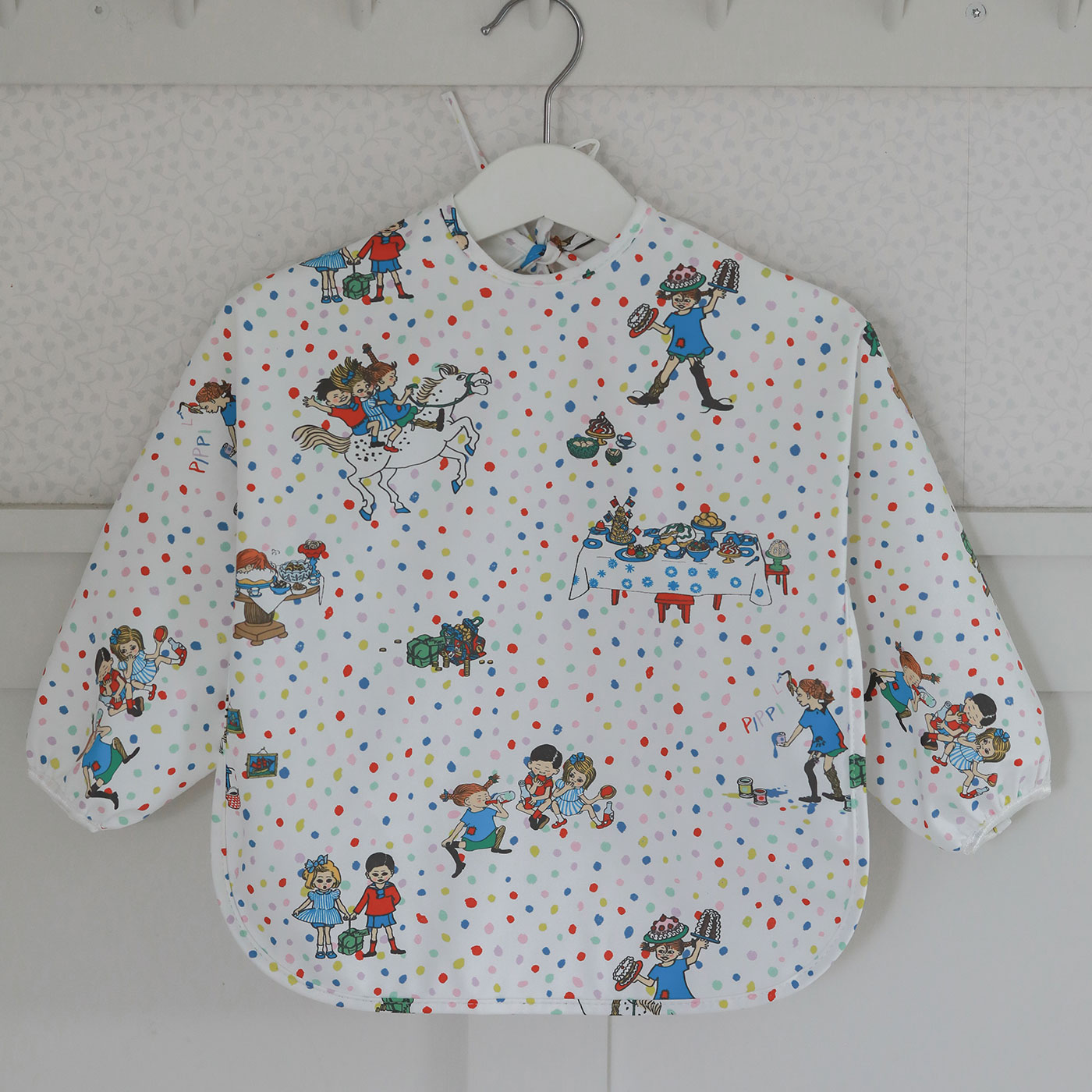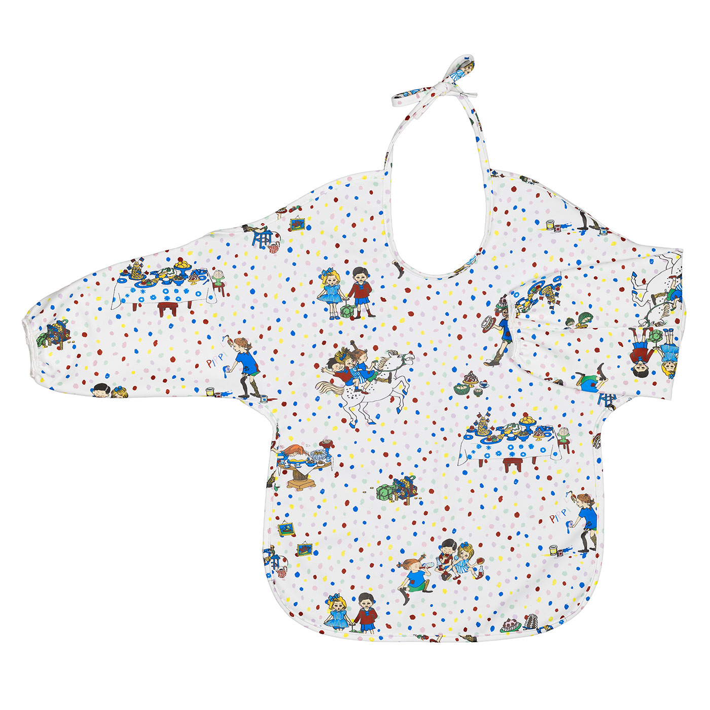 Pippi Födelsedag Haklapp med ärm gör måltiden enklare och roligare för små barn. Den praktiska designen med långa ärmar skyddar kläderna mot spill, samtidigt som det färgglada Pippi-motivet skapar glädje vid bordet.
