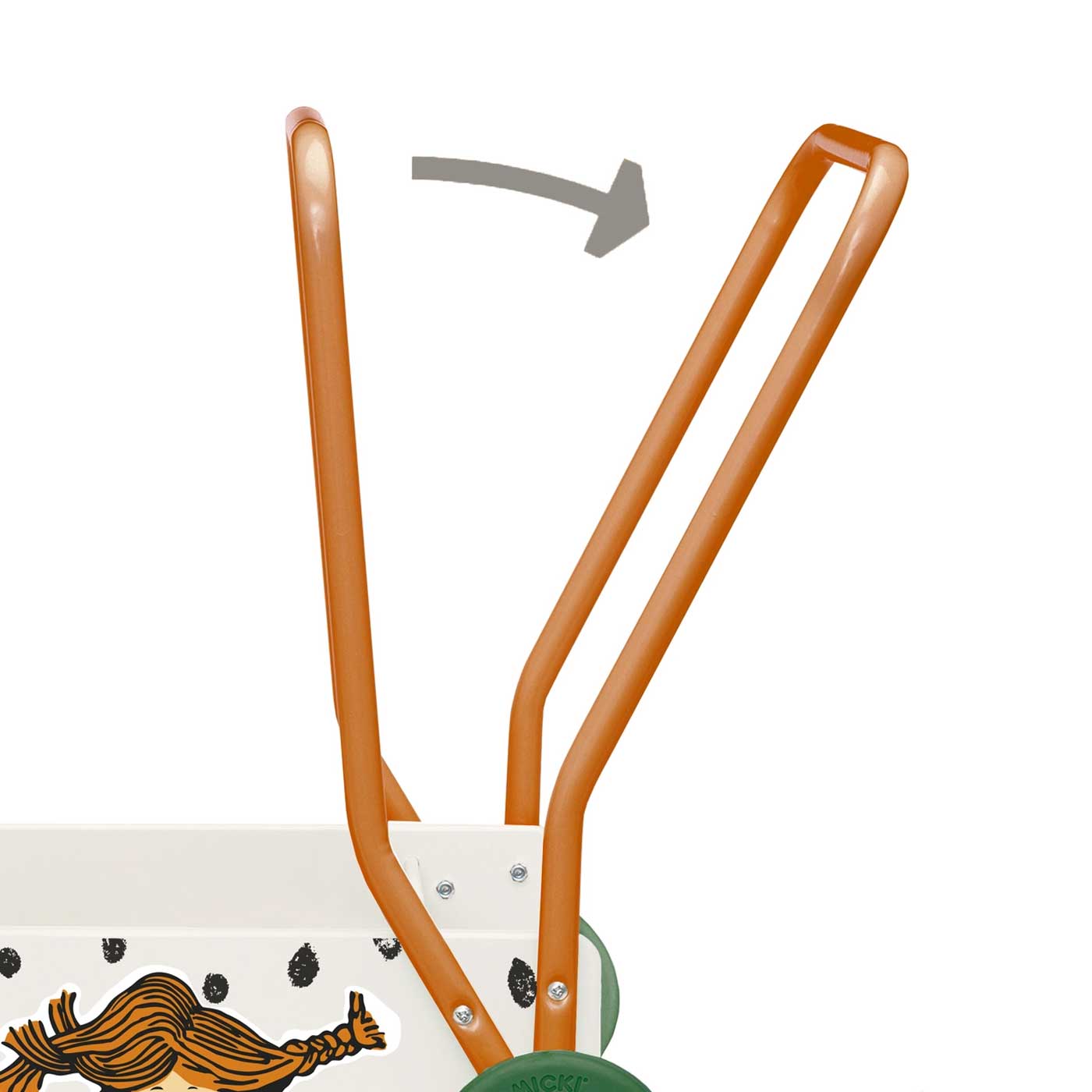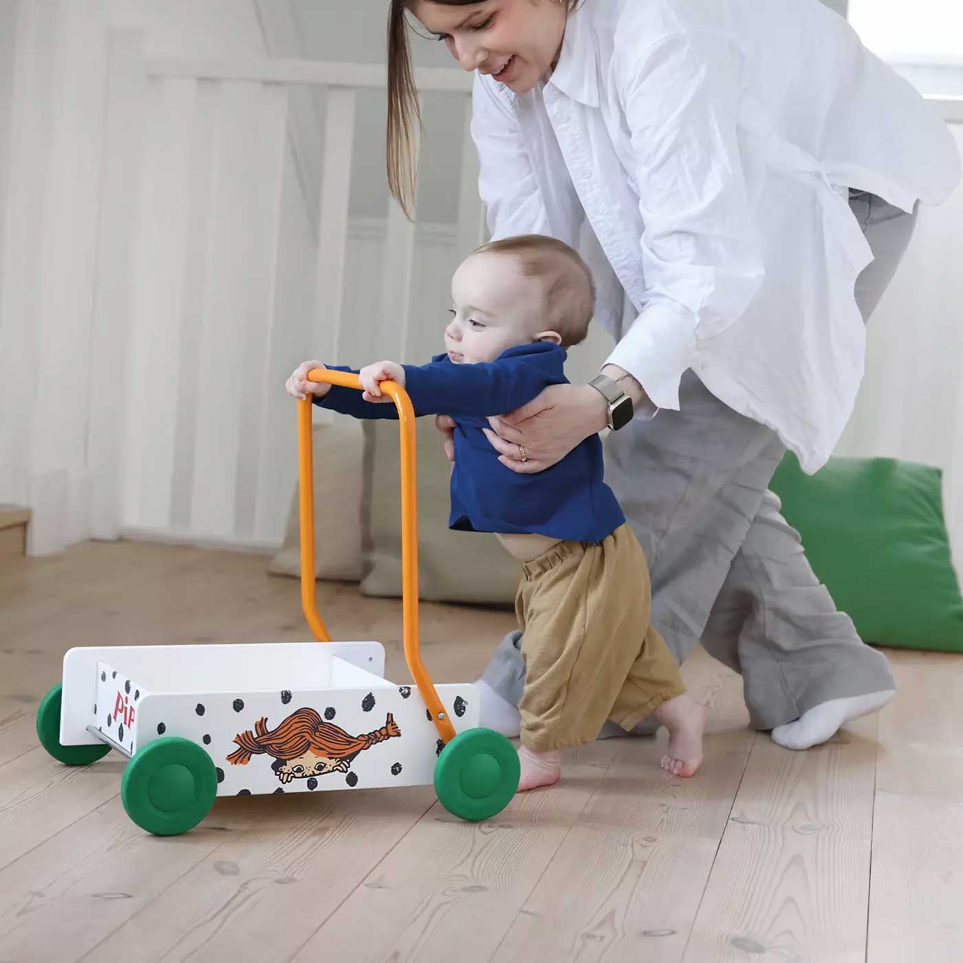 När gåträningen är avklarad kan handtaget justeras, och vagnen blir en rolig lekvagn som kan användas under flera år. Den fungerar lika bra för att köra runt klossar och leksaker som för att ta med Herr Nilsson på en fantasifull åktur.