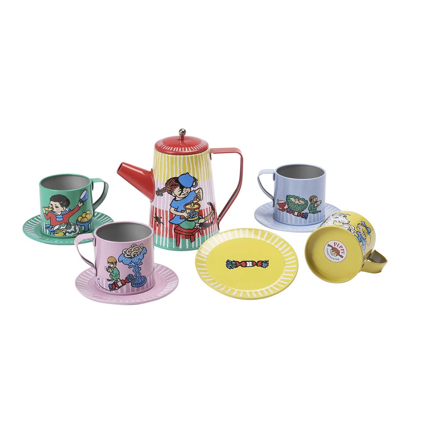 Med denna färgglada plåtservis kan barnen ordna tebjudning, picknick eller kalas för Pippi och hennes vänner. Setet inbjuder till många timmar av fantasi och rollek där bara barnets egen kreativitet sätter gränser.
