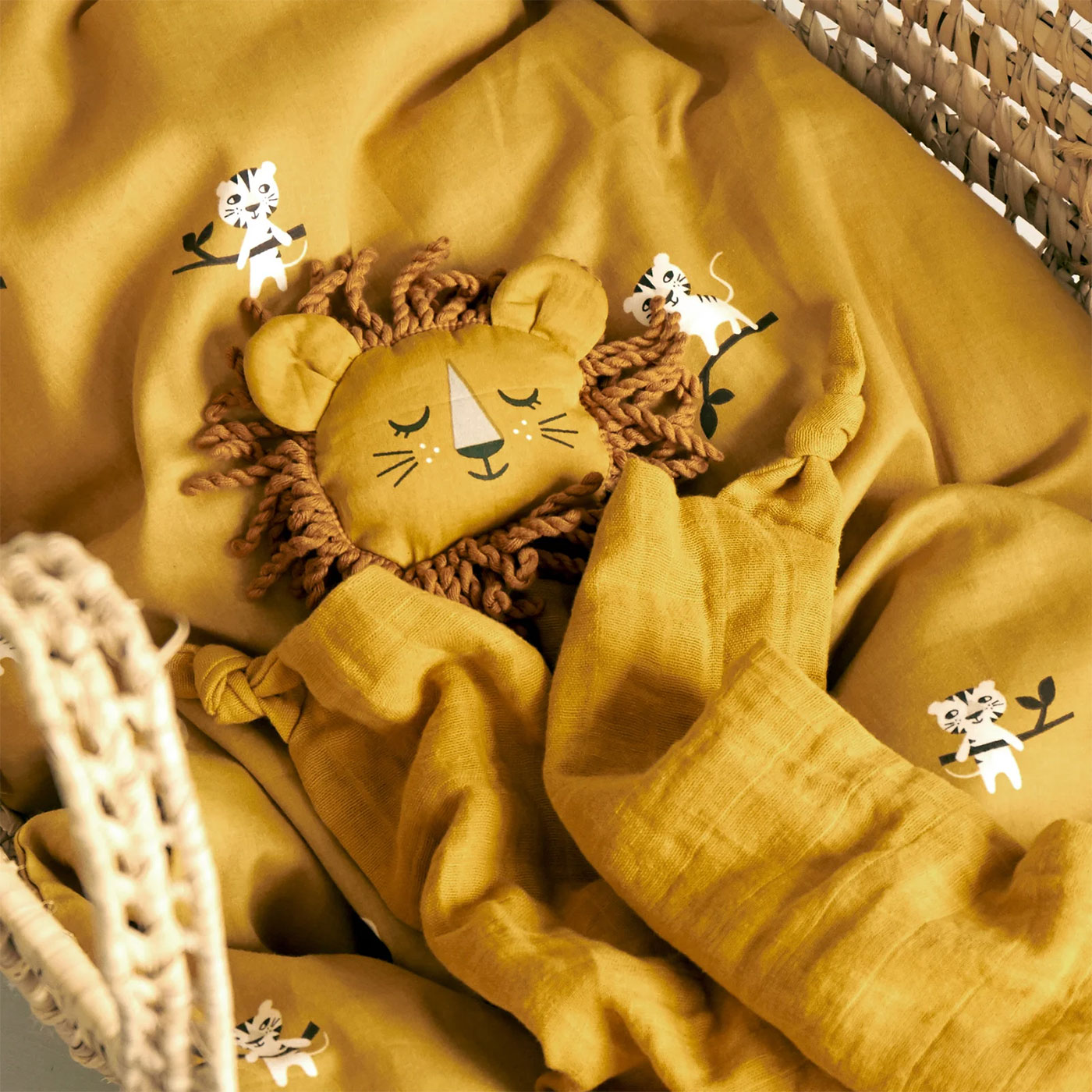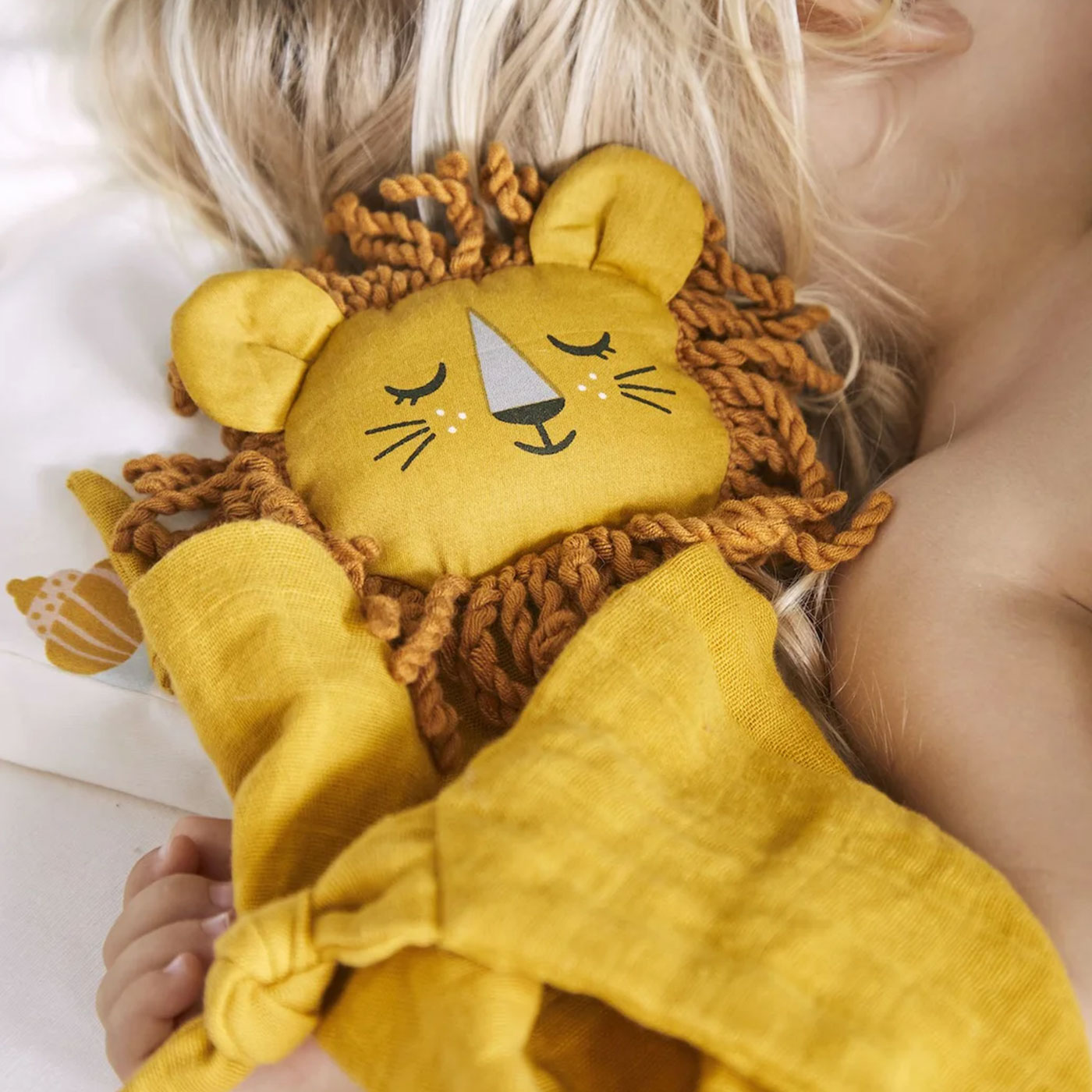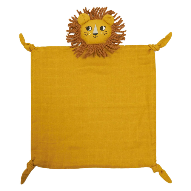 Snuttefilten är lätt och följsam, med knutna hörn som är enkla för små händer att greppa och utforska. Det mjuka lejonhuvudet ger både visuell och taktil stimulans och bidrar till att göra filten extra omtyckt som trygghet vid insomning.