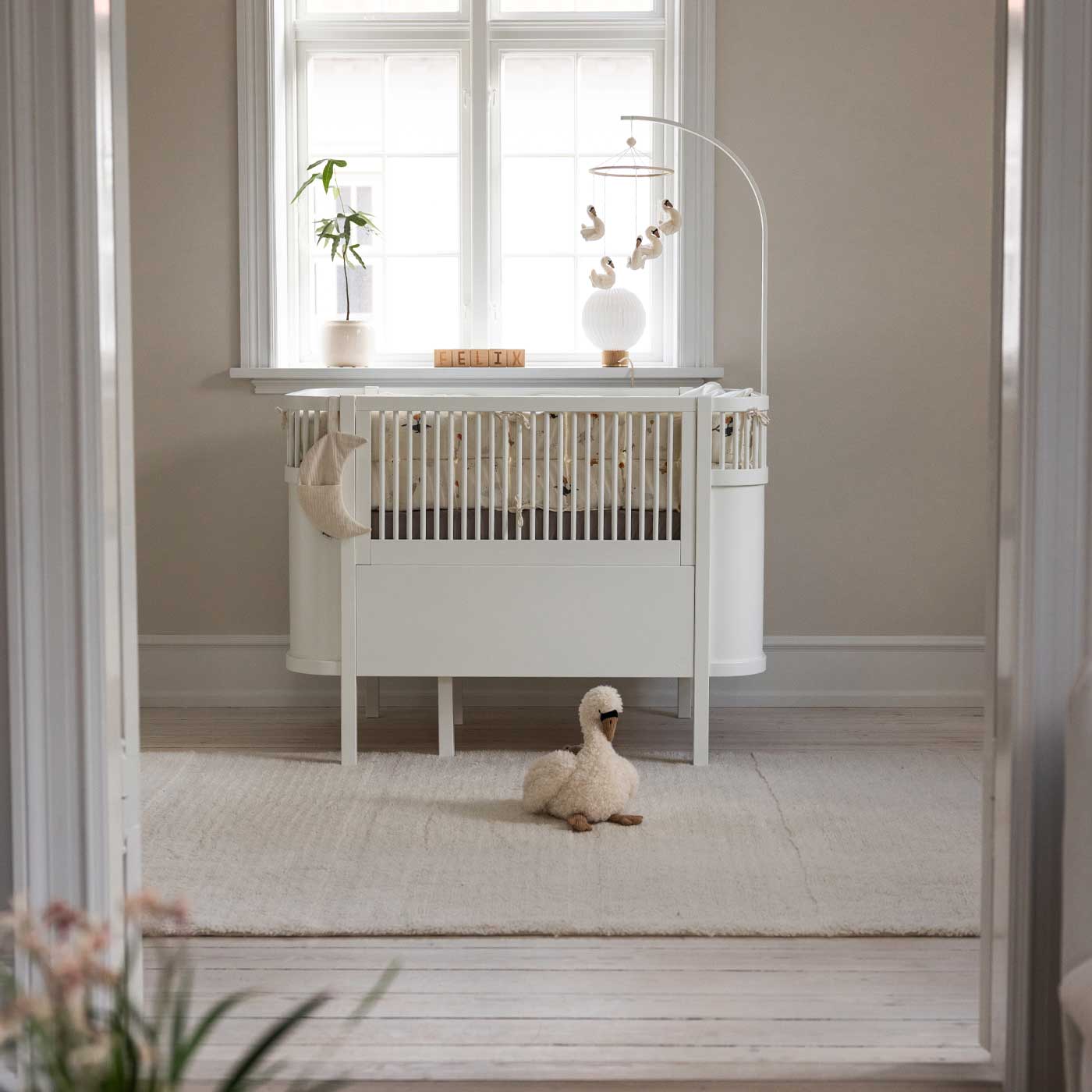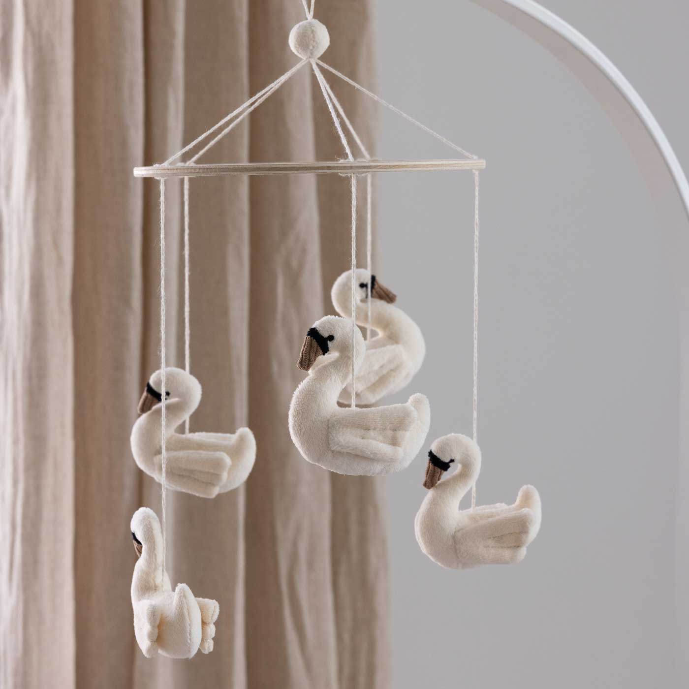 Skapa en lugn och drömmig atmosfär i barnrummet med denna vackra sängmobil från Sebra. Den eleganta svanen blir ett rofyllt blickfång ovanför spjälsängen eller skötbordet. Sängmobilen kan fästas direkt på en krok i taket, mobilarm eller på ett stativ till en sänghimmel.
