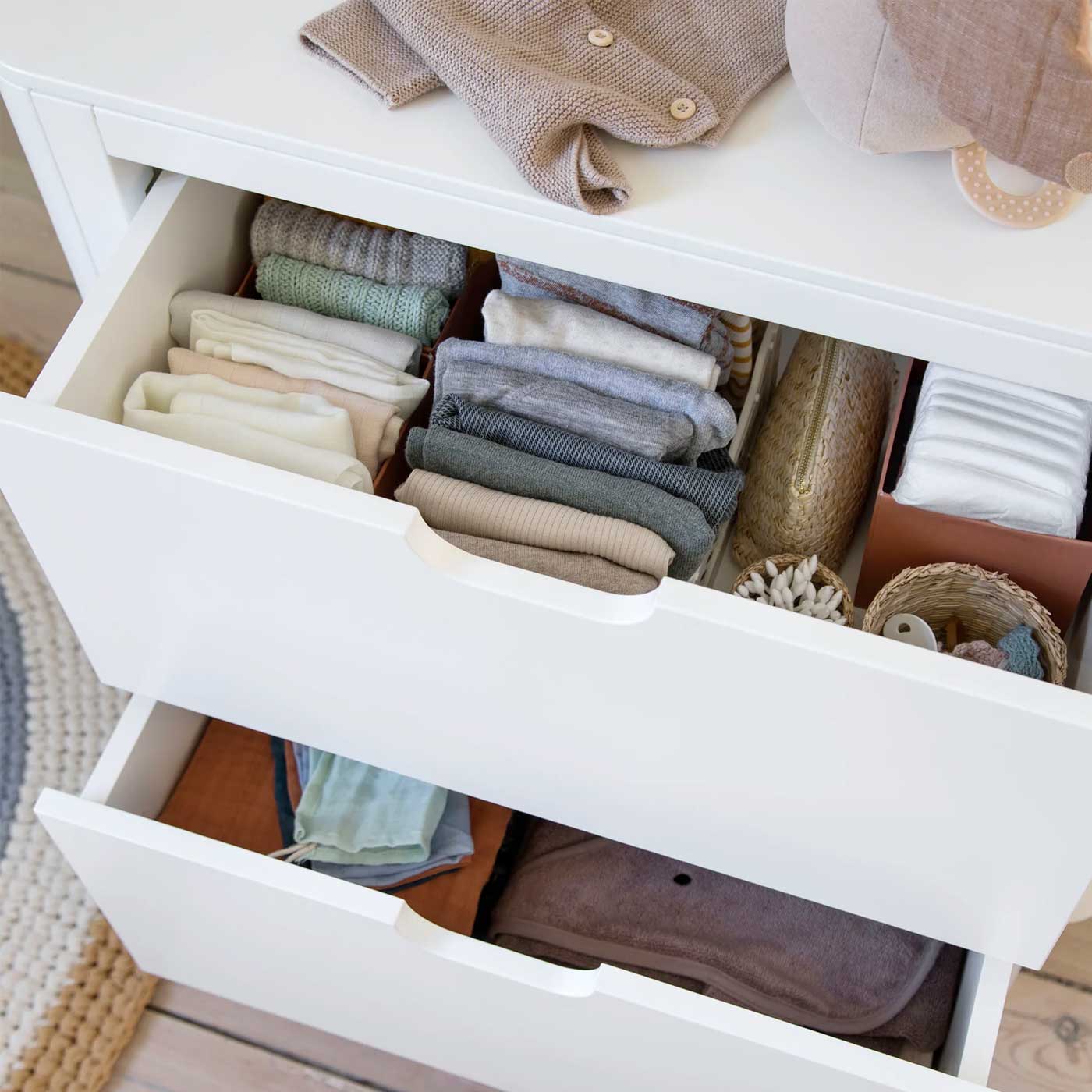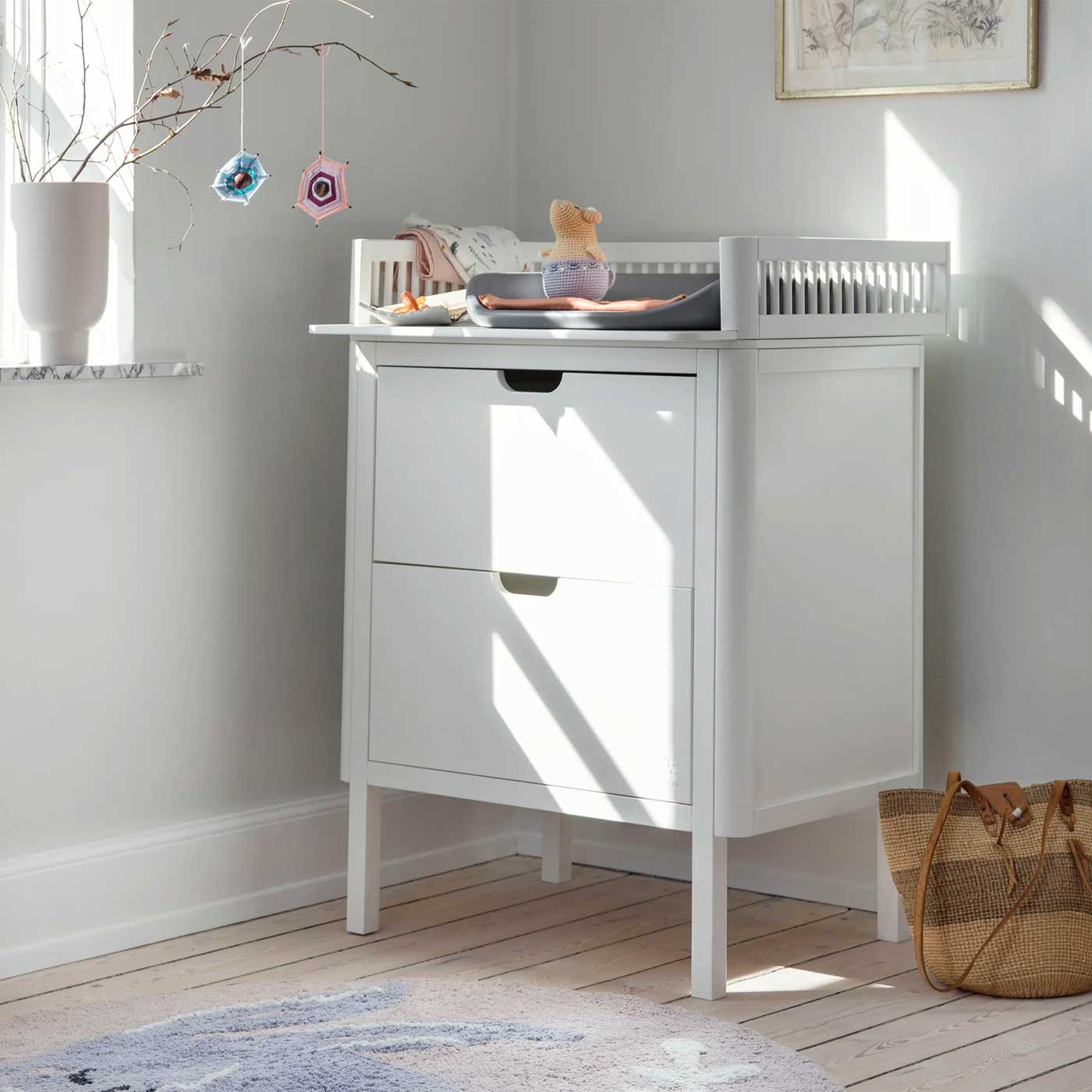 Skötbordet består av en rymlig byrå med avtagbar skötbordstopp. När blöjperioden är över kan skötbädden enkelt tas bort, och möbeln fortsätter som en praktisk förvaringslösning för kläder, leksaker eller andra saker.