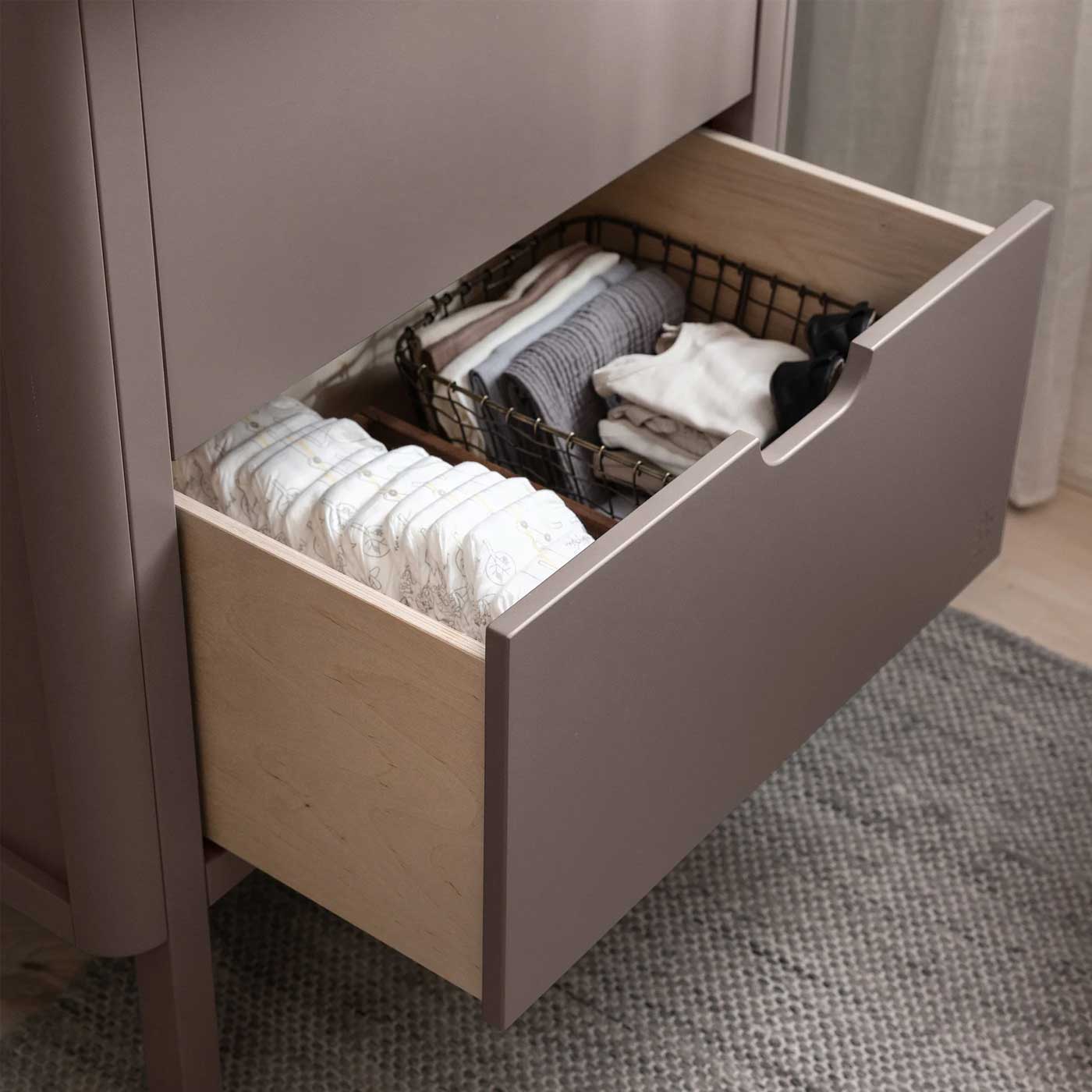 Byrån har rundade urtag som fungerar som handtag i mitten av lådorna – både snyggt och enkelt att greppa. Lådorna är utrustade med soft-close funktion, vilket gör att de stängs mjukt och tyst, utan risk för klämda fingrar eller smällande ljud.