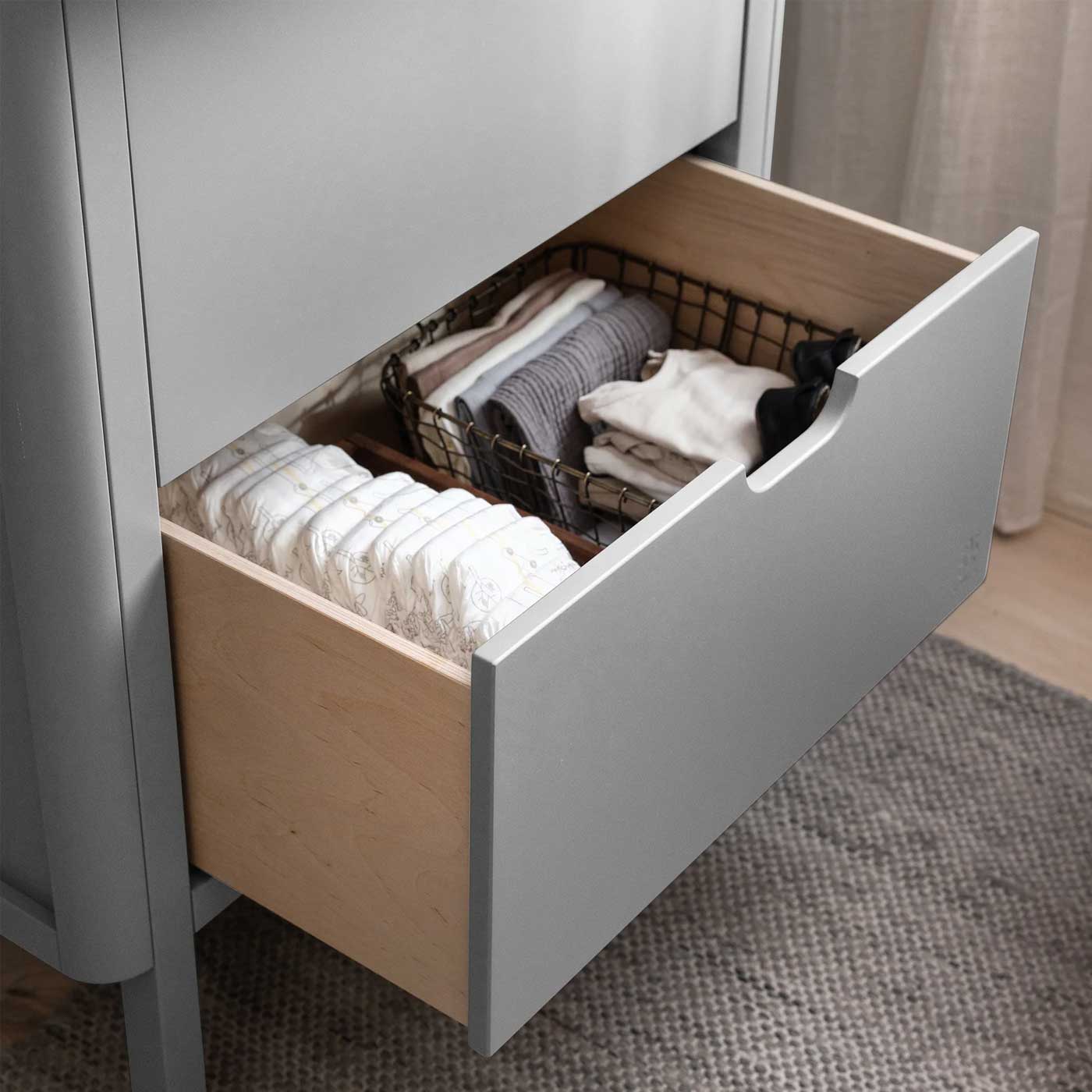 Skötbordet består av en rymlig byrå med avtagbar skötbordstopp. När blöjperioden är över kan skötbädden enkelt tas bort, och möbeln fortsätter som en praktisk förvaringslösning för kläder, leksaker eller andra saker.