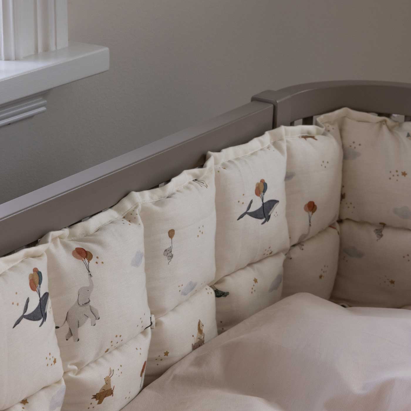 Skapa en trygg och ombonad sovmiljö för ditt barn med detta mjuka och lyxiga spjälskyddet som skyddar ditt barn från spjälsängens hårda kanter och hindrar nappar från att ramla ut under natten. Spjälskyddet är tillverkat av certifierad ekologisk bomull och har en insida av allergivänlig kapok.