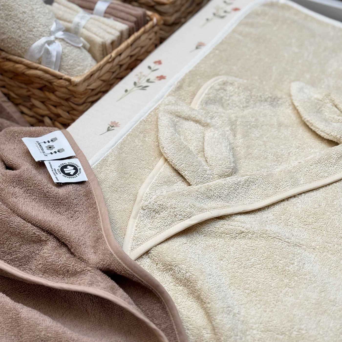Summerville Badcape Kanin sandshell GOTS är en mjuk och mysig badcape i ekologisk bomull med huva och söta kaninöron, perfekt att svepa in din bebis i efter badet. Det här blir garanterat en favorit i många badrum framöver!