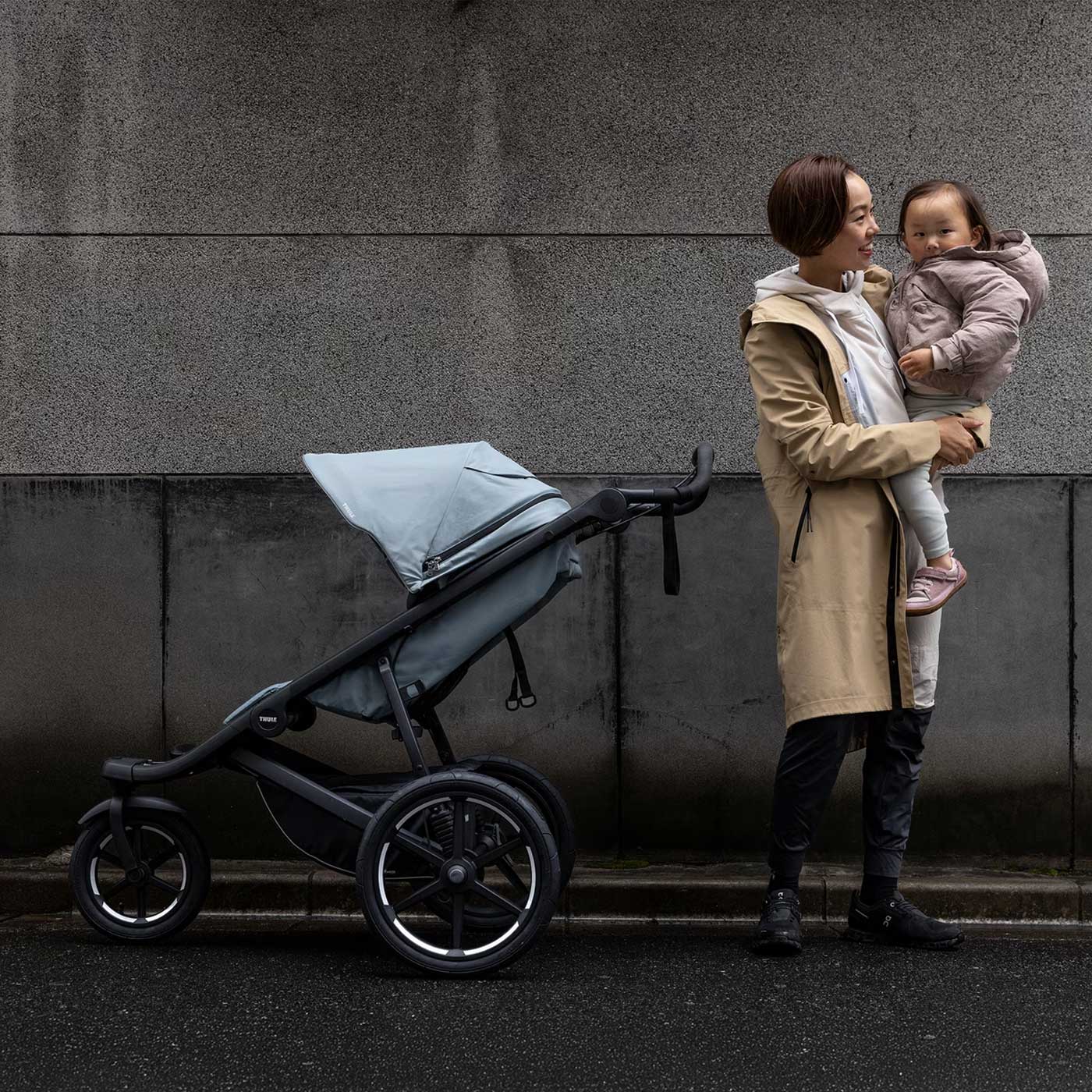 Med sina 16-tums stora lufthjul bak, fjädring och ett svängbart framhjul är Urban Glide 3 enkel att manövrera oavsett underlag. Framhjulet kan låsas vid tuffare terräng. Det ergonomiska, justerbara handtaget säkerställer en bekväm körställning för föräldern.