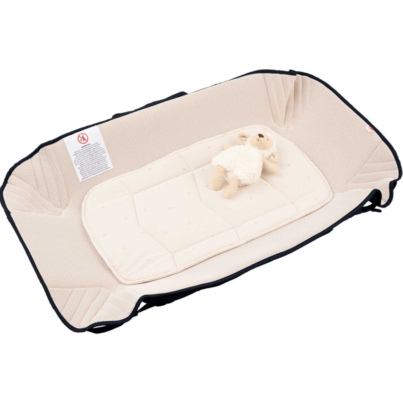 Babyliften har ett mjukt topplock som är vind- och vattenavvisande och ger extra skydd utomhus. Locket öppnas eller tas bort smidigt med dragkedjor och kan även användas som ett täcke. Babyliftens botten har en tålig yta som är enkel att torka av och trygg att placera på olika underlag.