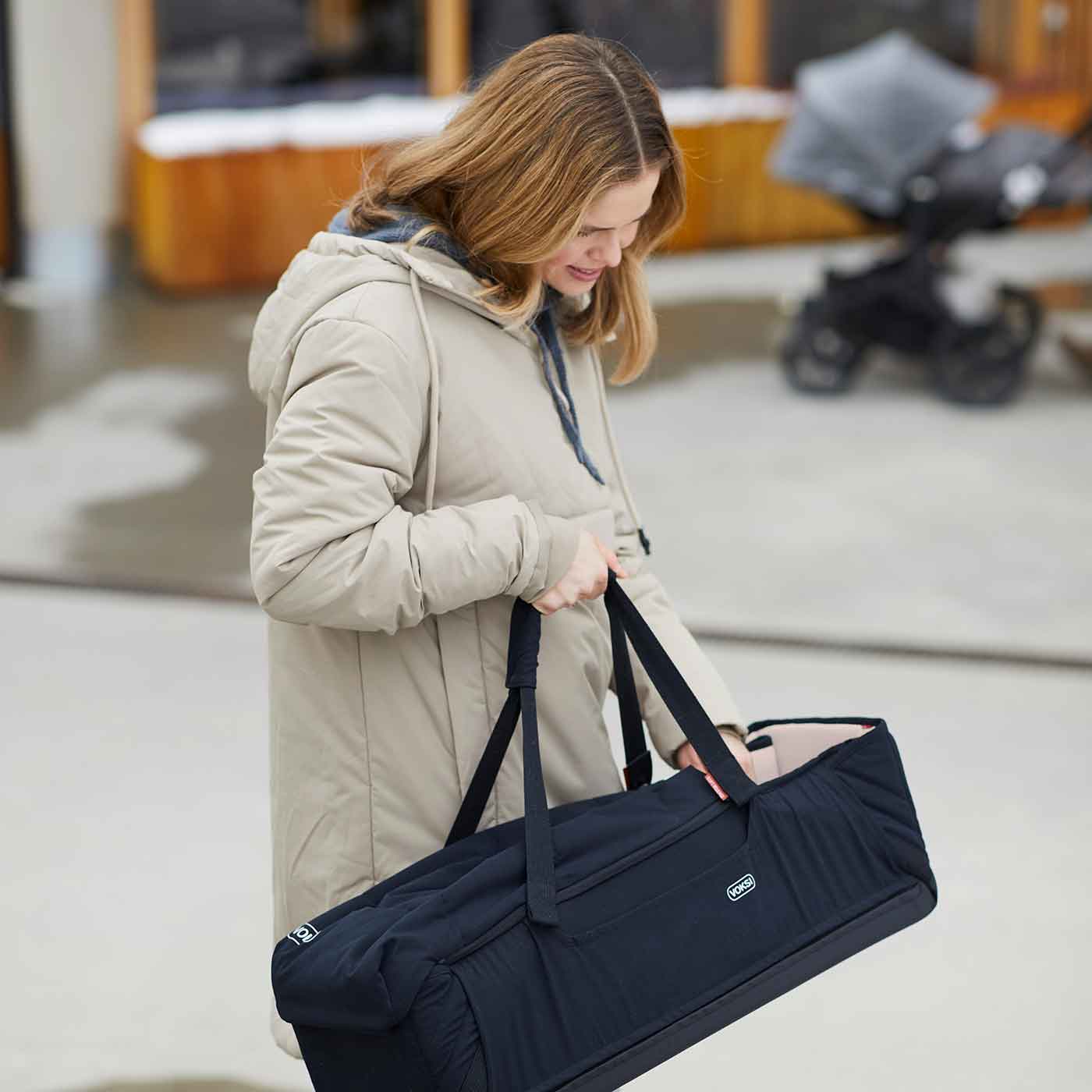 - Placera gärna din Voksi Carry Me inuti en spjälsäng och öppna alla hörn under sovstunden