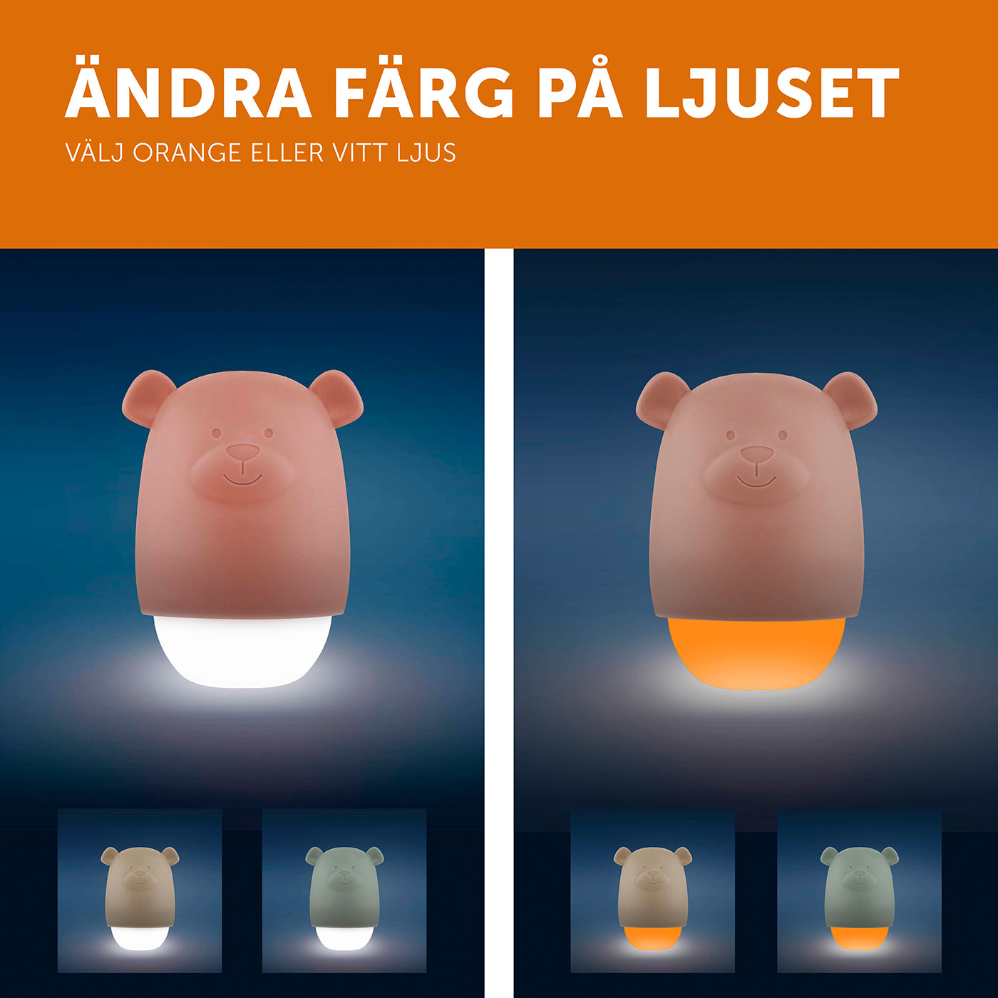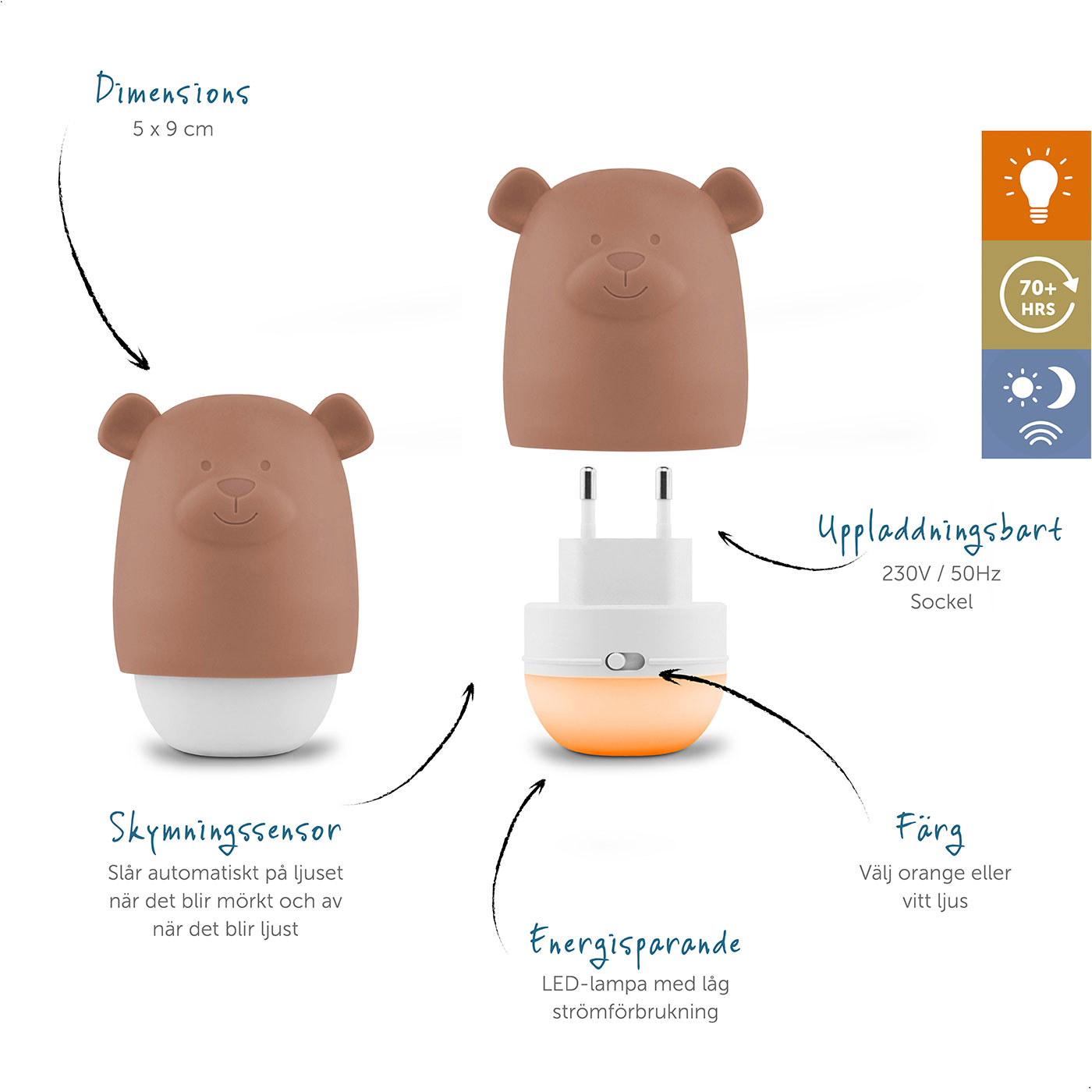 Benny tänds automatiskt när det blir mörkt och släcks igen när dagsljuset kommer tillbaka, tack vare sin smarta skymningssensor. Du kan välja mellan två behagliga ljuslägen – varmt vitt ljus för bra allmänbelysning eller mjukt orange sken som skapar en dovare och lugnare atmosfär inför natten. Nattlampan är utformad med tanke på barnens trygghet och enkelhet – inga sladdar, inga knappar som ska tryckas, bara ett behagligt ljus som gör natten mjukare och lugnare.