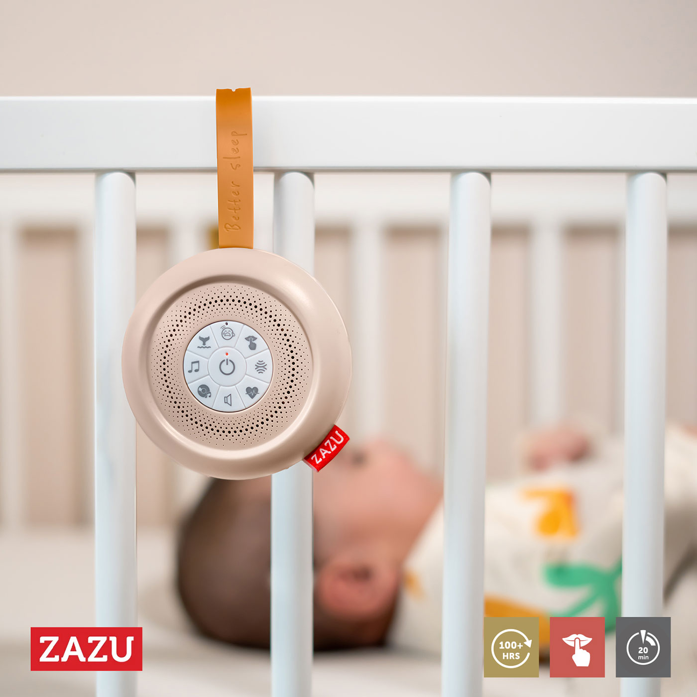 Suzy efterliknar de trygga ljuden från livmodern, så barnet känner sig säkert och avslappnat. Med 14 olika ljud och 16 melodier finns alltid något som lugnar, oavsett om det är dags för nattning eller en snabb tupplur.